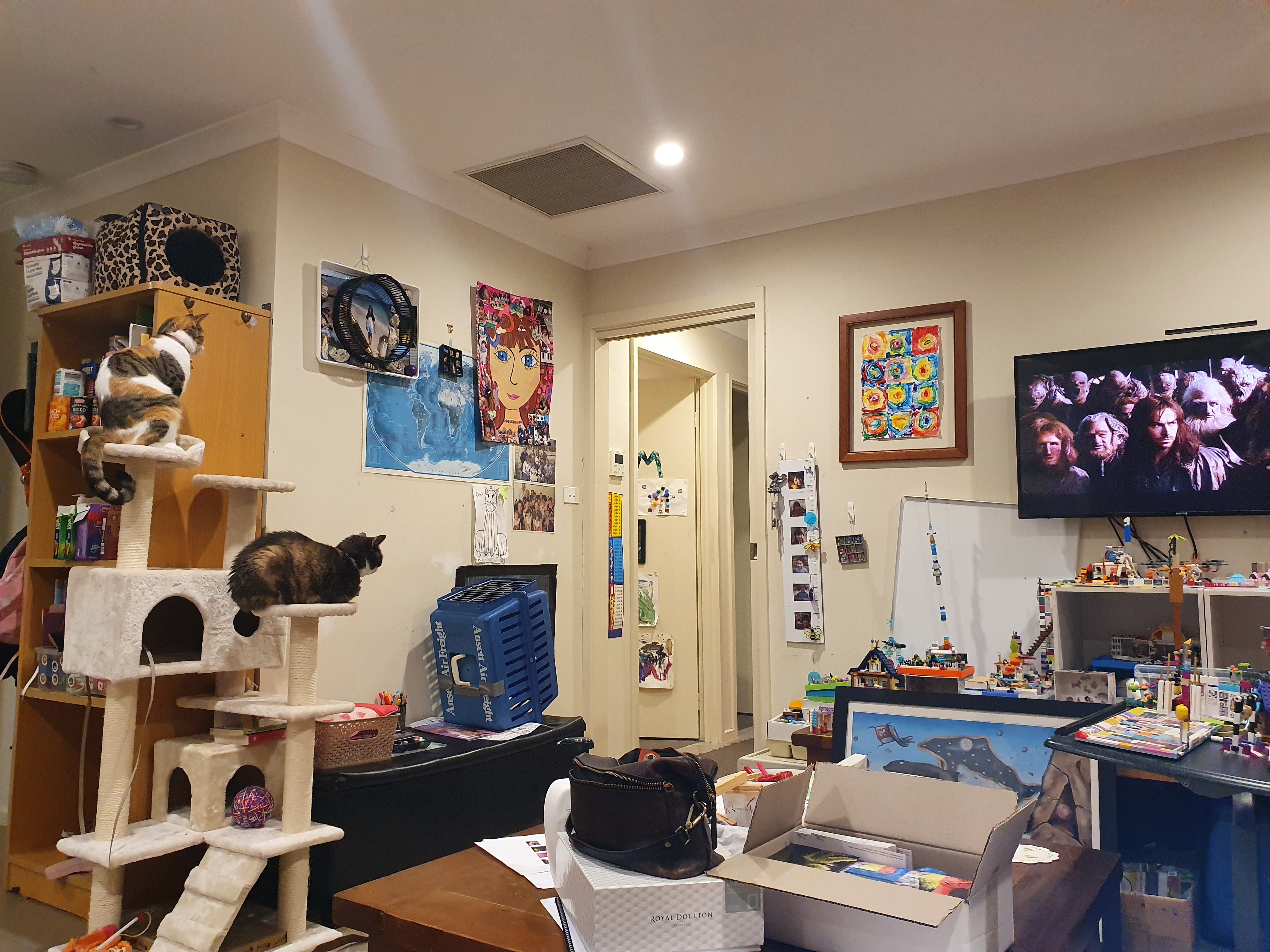 The “TV” is on a pile of my clothing, on my desk, wedged into an old fridge drawer, with an extension cord plugging it into the bathroom.