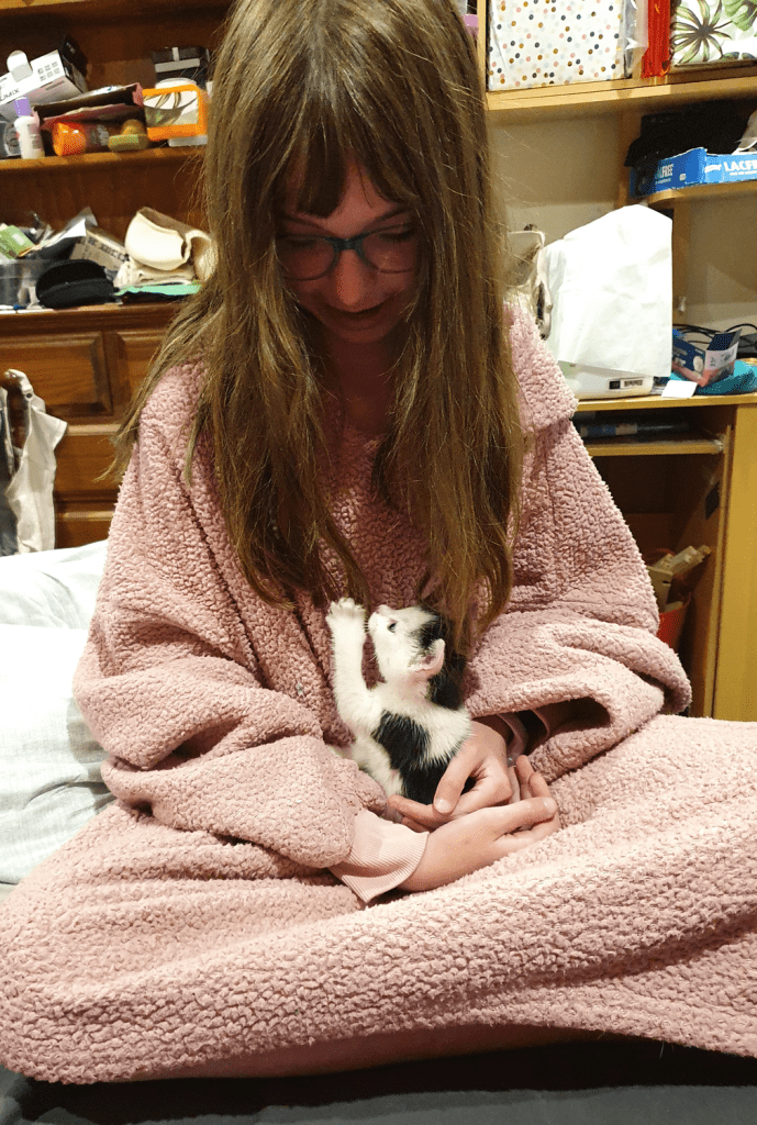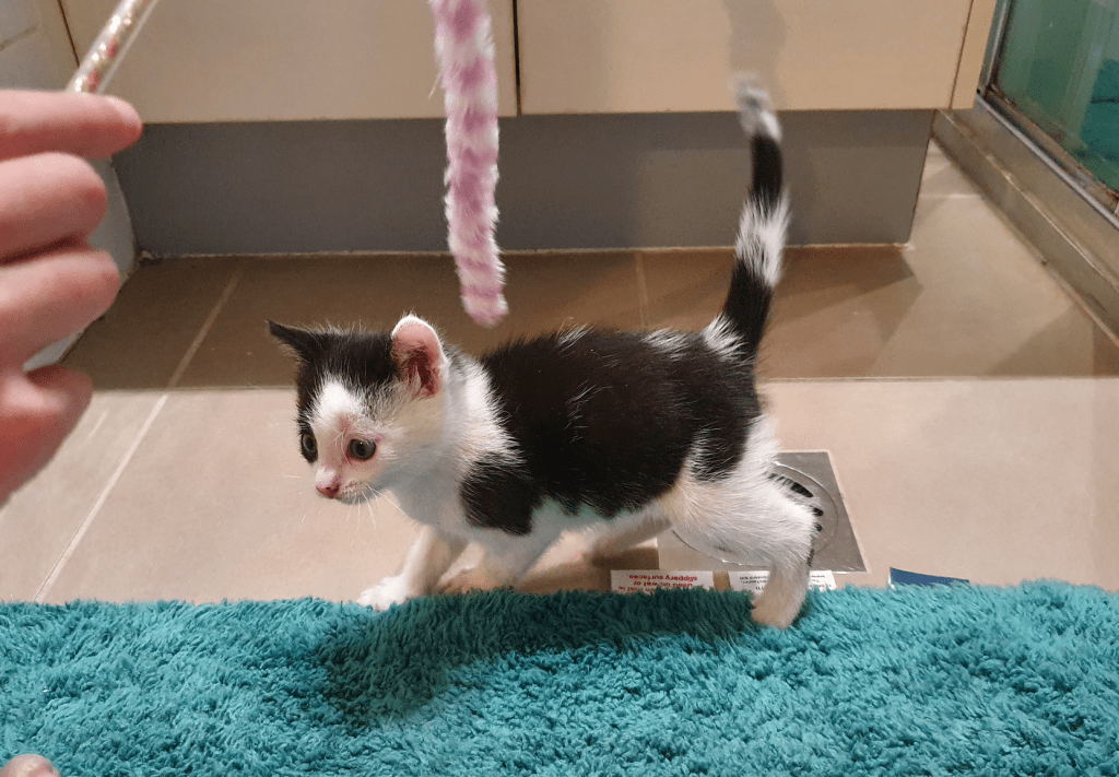 I told my kids they could now pat him, but would have to wash and sanitise their hands afterwards. Lizzie went for it, and Tim declined. Buttons really wanted to both snuggle and play, so we introduced a cat toy (that I knew my cats loved—so he could start to get used to their scent, and vice versa).