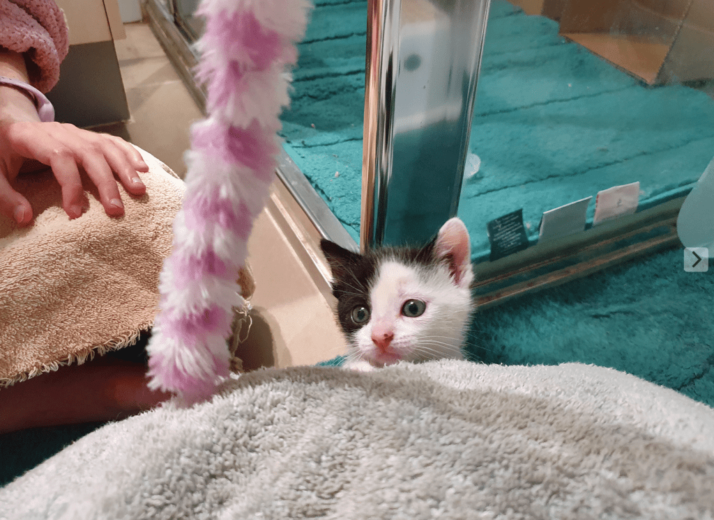 Once we were home, I set up my shower with all the basics: A nice thick bath mat, for comfort and warmth; the heat pack; an upturned lid with milk; another lid with food, a makeshift litter box; and a makeshift ‘cave’ for it to hide inside (which it LOVED).