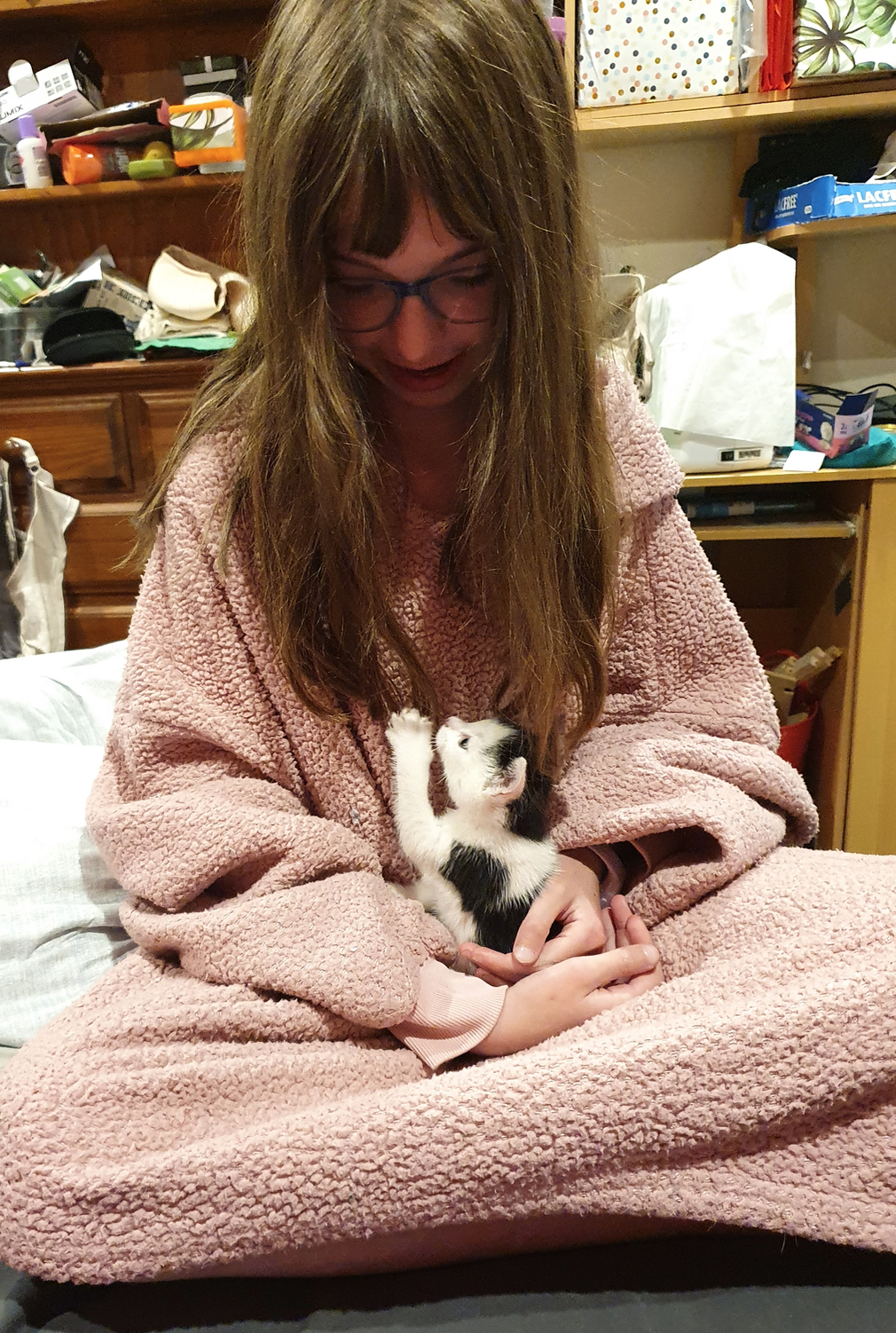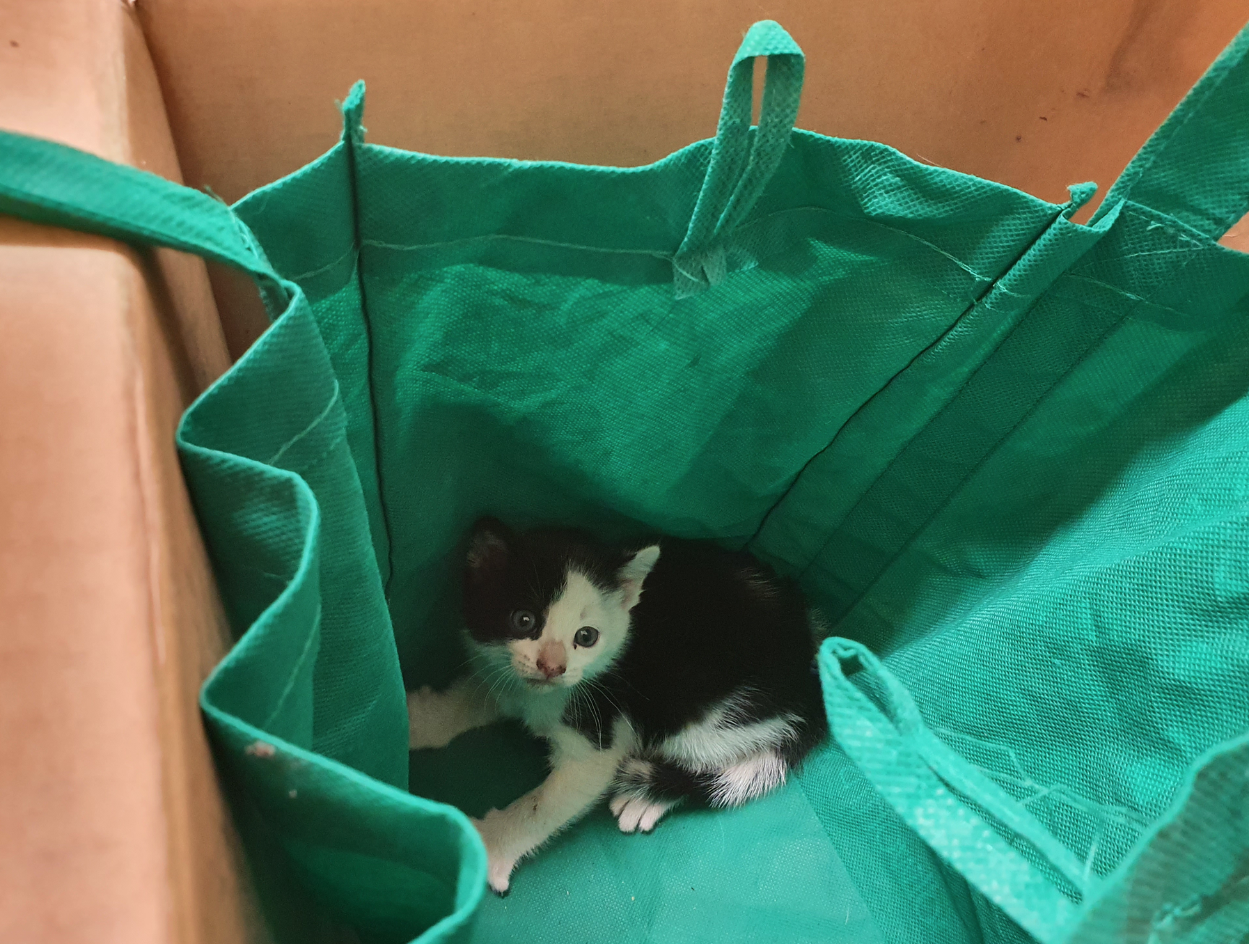 We went back to see if we could catch them, and then stood around in the shed like fools, knowing there was no way we could get under the floorboards. Then she spotted the kitten watching us from behind a piece of wood and, between us, we caught it and put it inside a shopping bag.