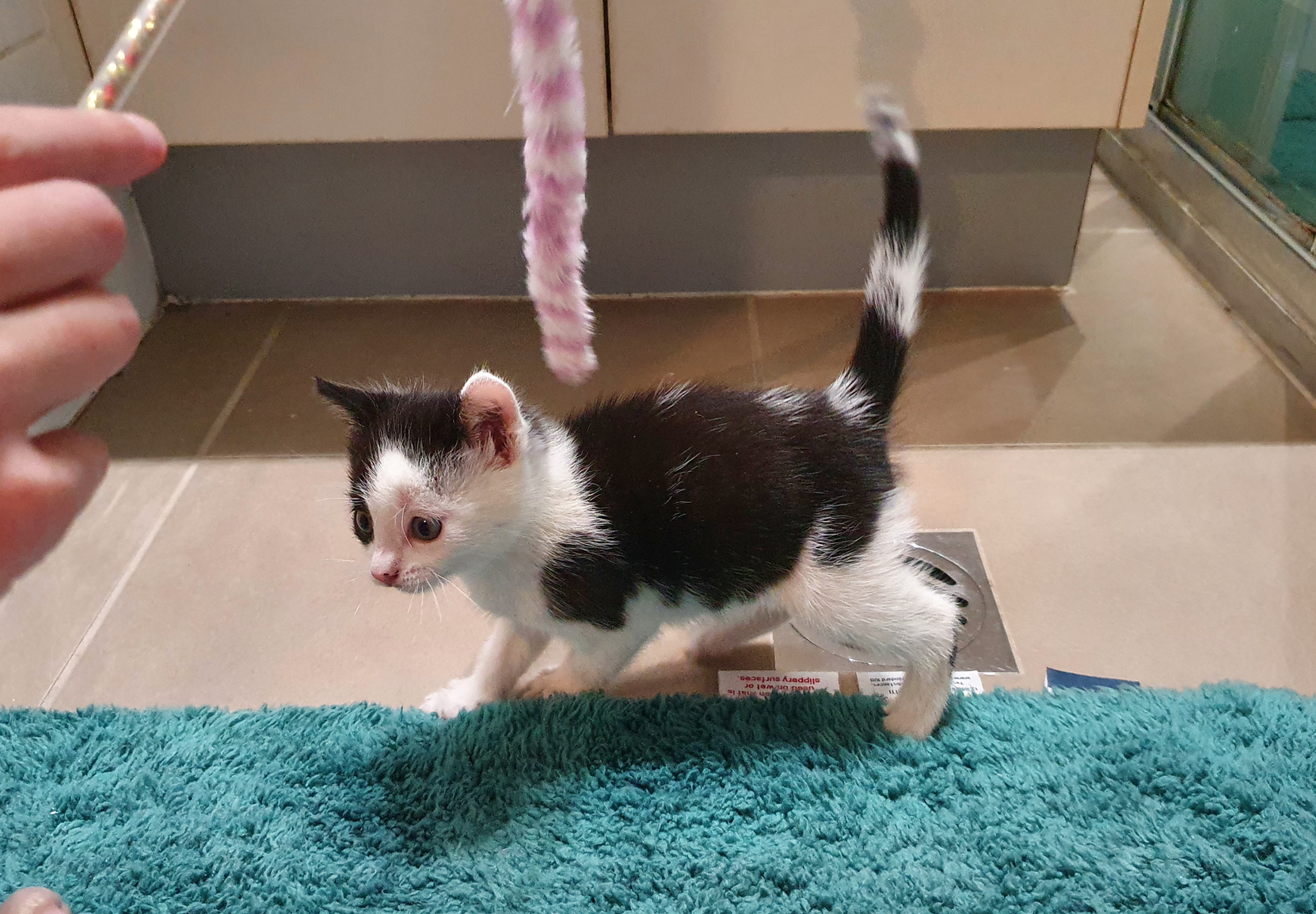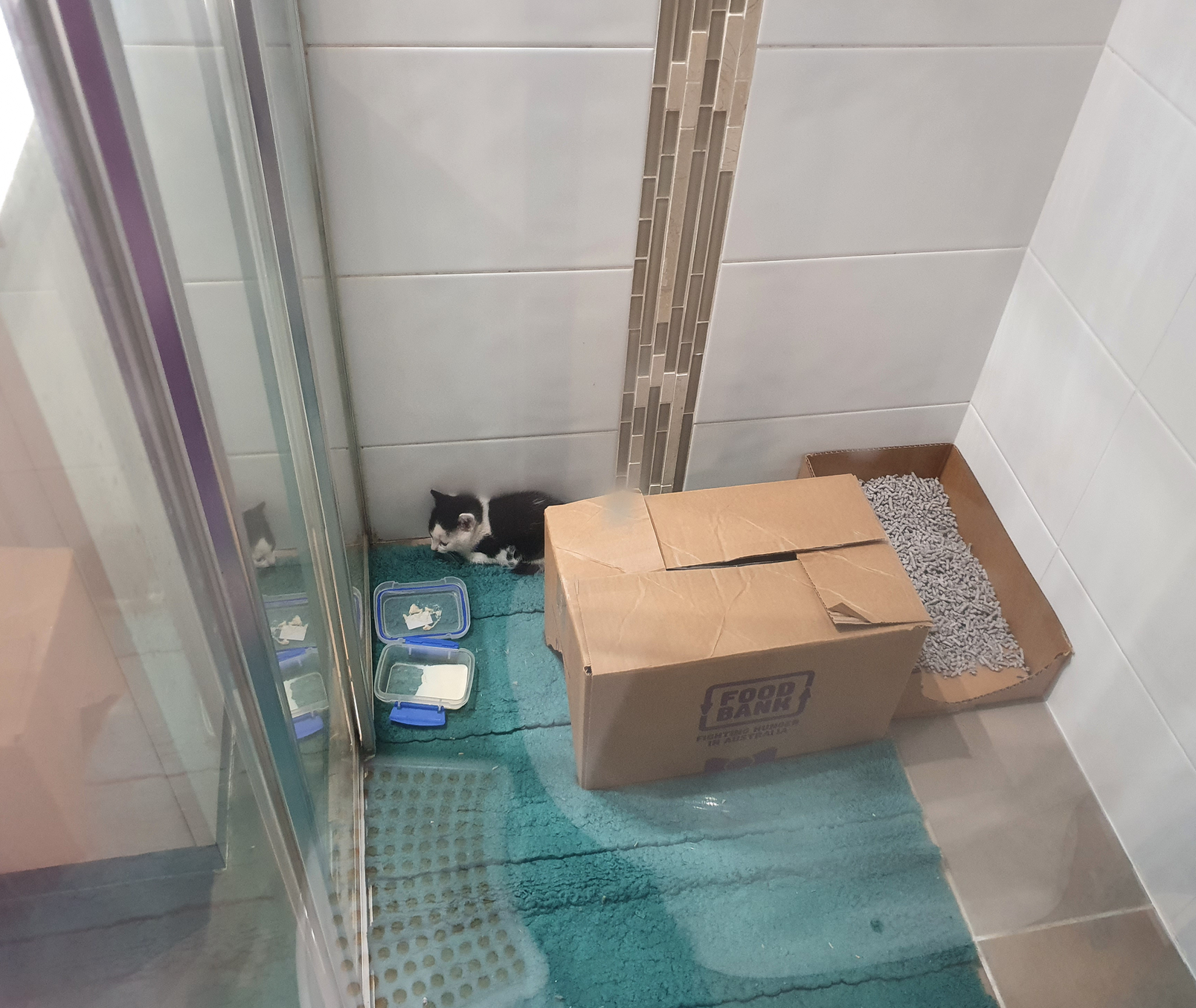Once we were home, I set up my shower with all the basics: A nice thick bath mat, for comfort and warmth; the heat pack; an upturned lid with milk; another lid with food, a makeshift litter box; and a makeshift ‘cave’ for it to hide inside (which it LOVED).