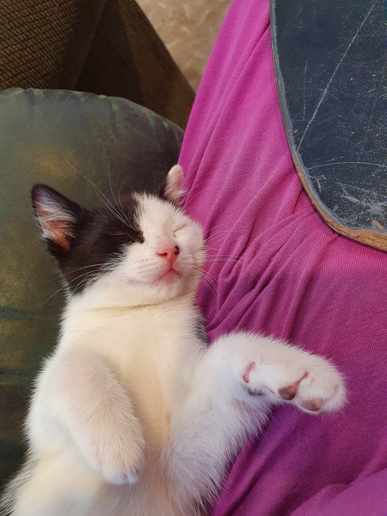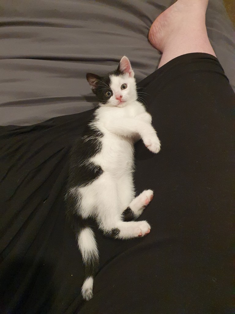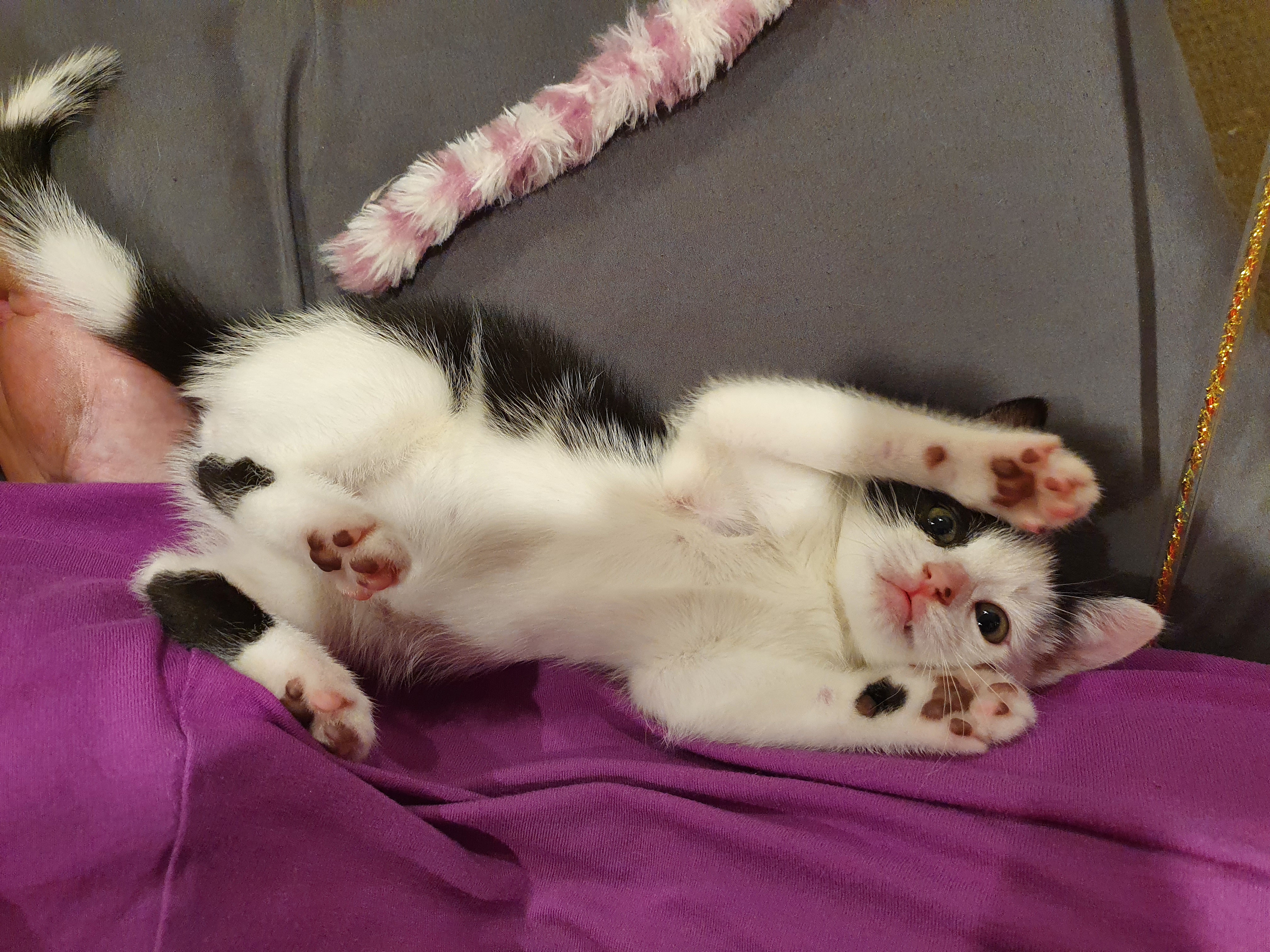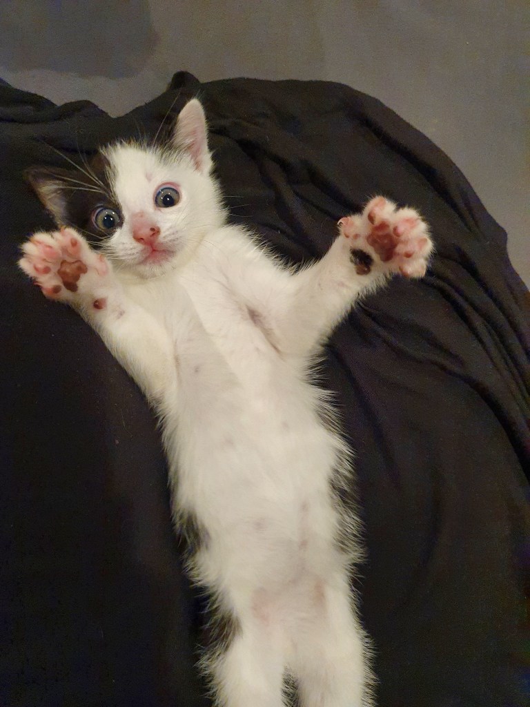 He’s already learned not to climb humans, or to have his claws out at all if he’s playing with us. (From Day 1, he was clearly moderating his violence in order to not harm us, but he was still drawing blood frequently.) It’s not perfect, but he’s well above the usual standard for his age (now seven weeks). Well done Buttons!