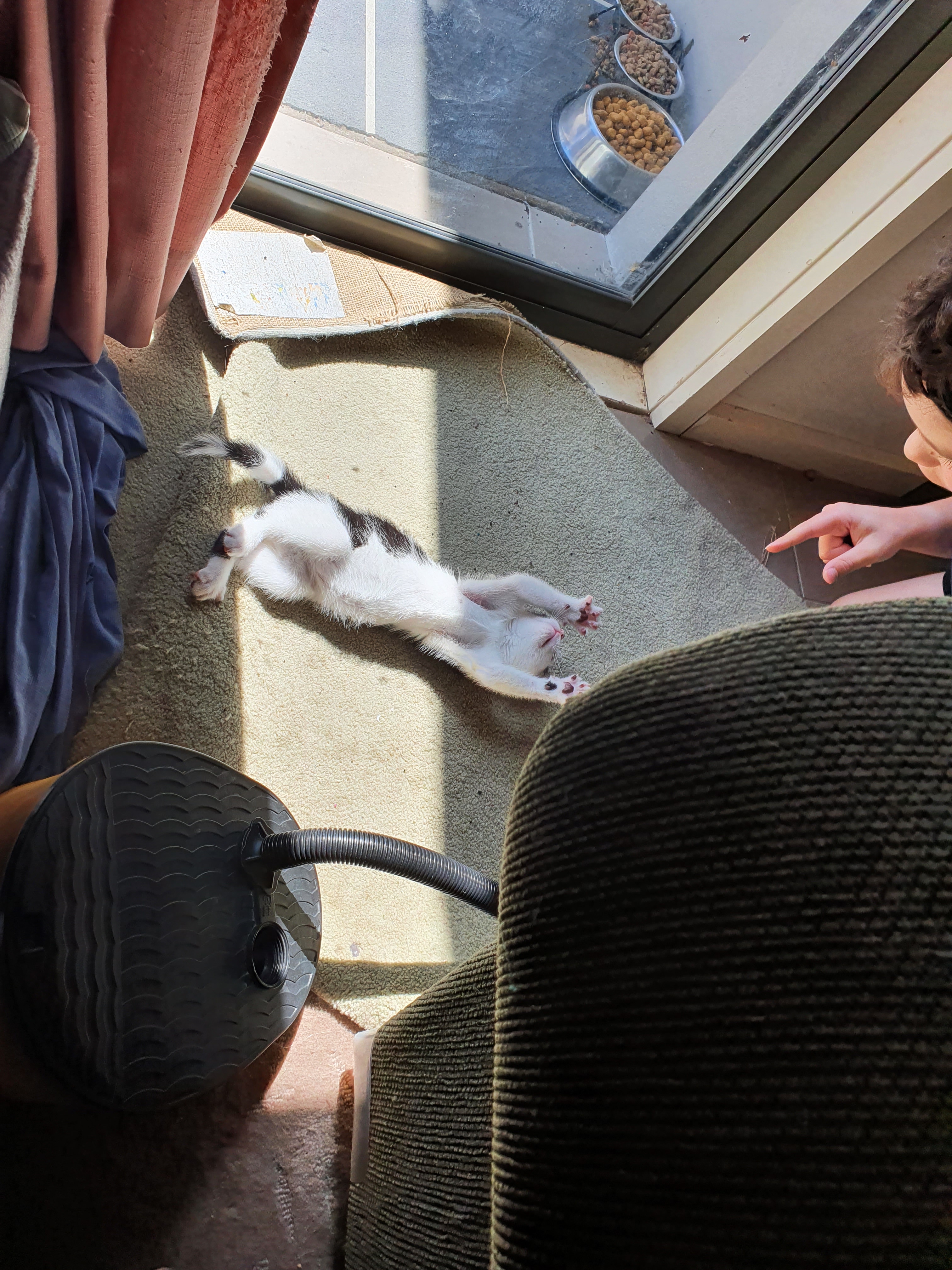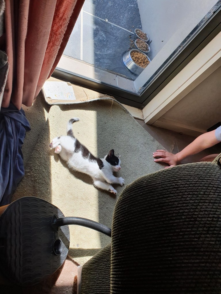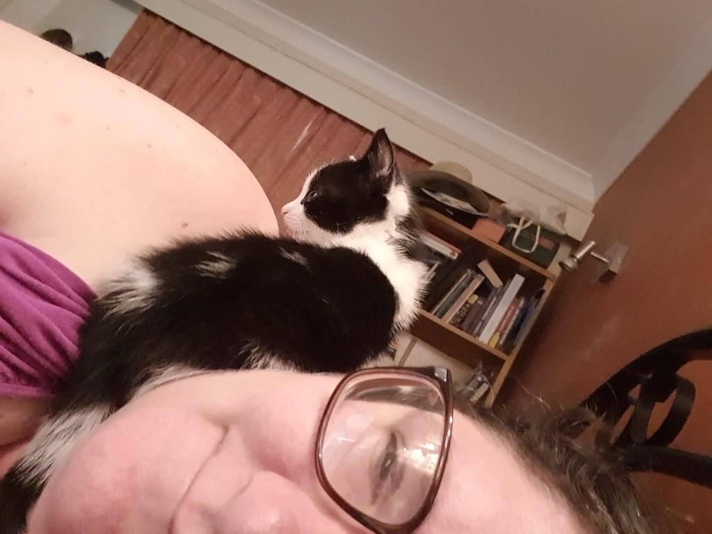In this video, you can see that Zoom (the older cat) is curious about Buttons, and is nervous of him but confident enough to do some experimental slow blinks (remember how that was the very first sign that I’d made positive contact with Buttons?) and to look pleadingly at me. If she was still properly afraid of Buttons, she wouldn’t take her eyes off him—and she wouldn’t try to sniff him.