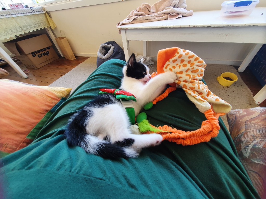 This is where he’s shown the most dramatic improvement (not even counting our initial meeting, when he tried to kill me). He wants to snuggle a LOT but he wants to be playing even more. The perfect solution in his mind is to be attacking his human family. Toes and fingers and arms and unprotected bellies, oh my. Warm, loving, AND delicious!