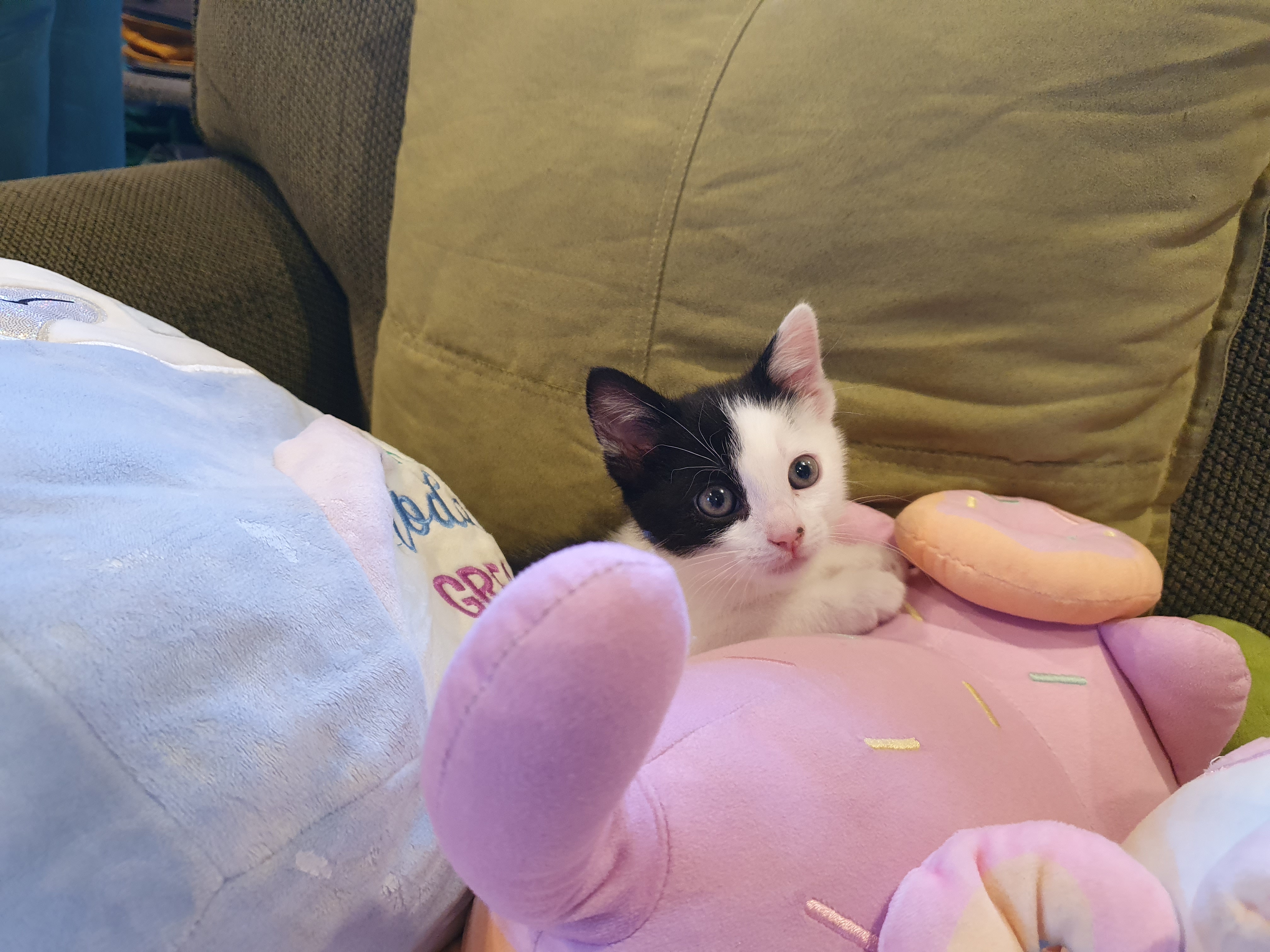 Yes, a little. Couches are my Achilles’ Heel when it comes to training cats. When a kitten is tiny, it is natural for it to climb up beds and couches because it’s too little to jump that distance. And it’s adorable. But by the time the kitten is old enough to jump that high, the bad habit of using claws on the couch is already formed. Buttons definitely much prefers the cat tower, so hopefully his new owners have a couch that’s not too alluring.