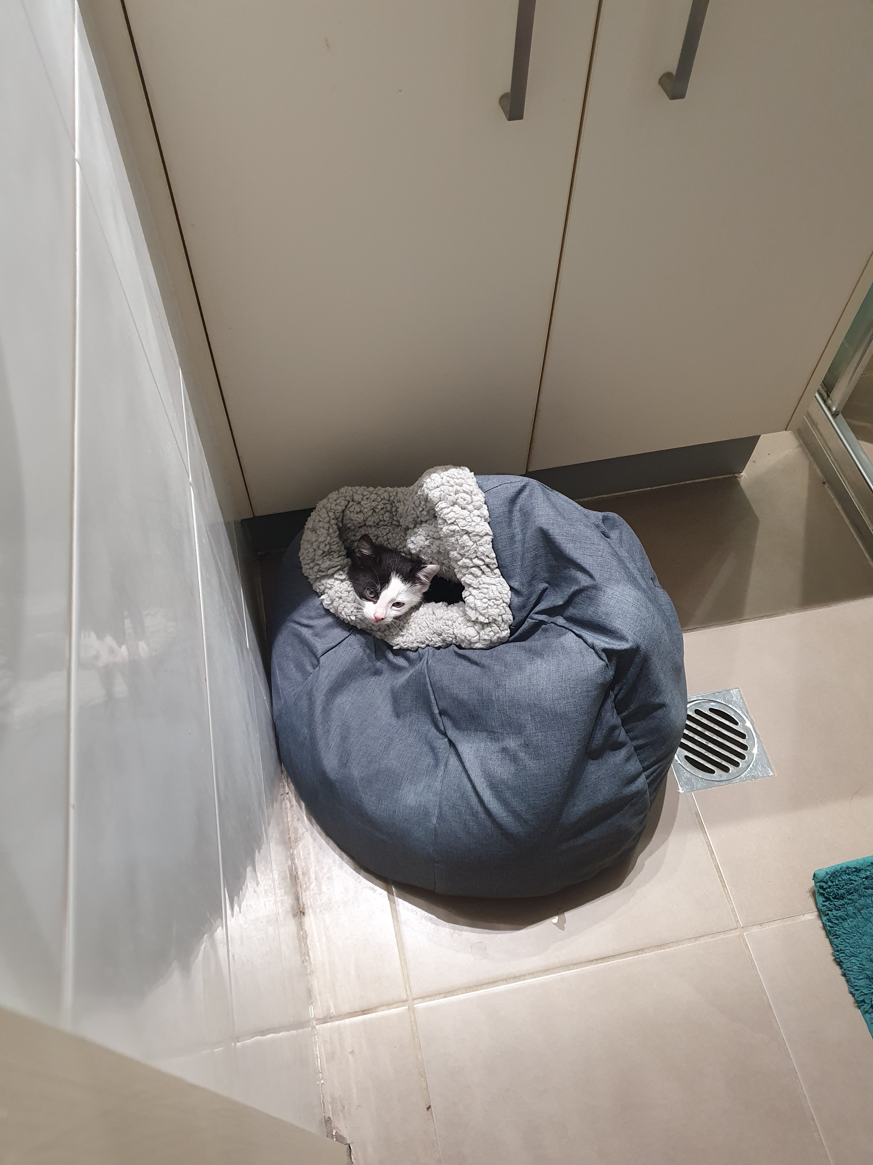 Now that I don’t lock him in the shower each night, he tries his best to escape the bathroom any time someone actually uses the toilet. Ah well.