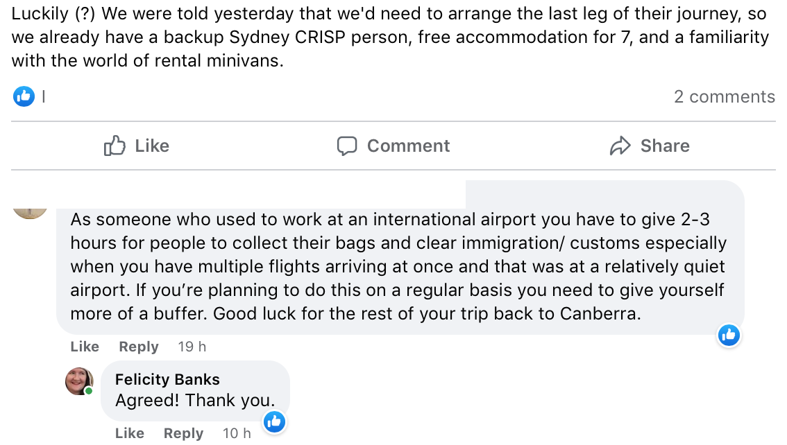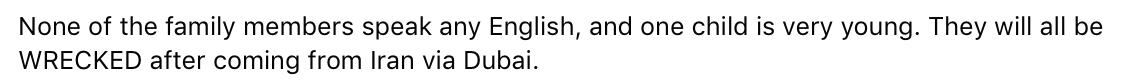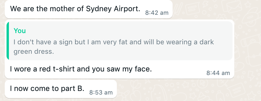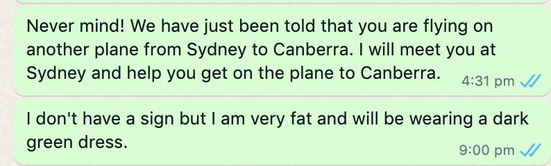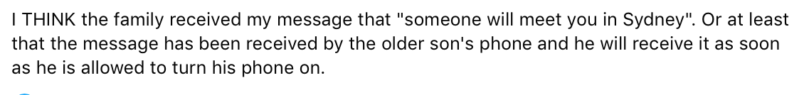 But there was literally no way for them to know that someone in Iran had arranged for them to fly onwards to Canberra. I wasn’t 100% certain they even knew that we (the Castle of Kindness) knew they were coming via Sydney instead of Melbourne (we’d discussed the Melbourne plan with them in detail).