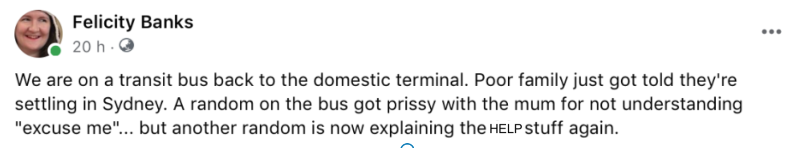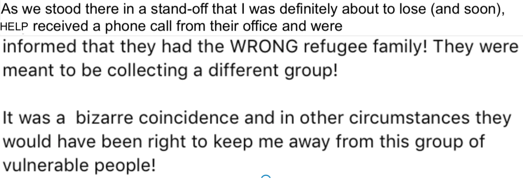 They had already met ‘our’ Afghan refugee family as they stepped off the plane (because they’re an official and well-respected organisation and are allowed to help people through immigration) and been their only support for several exhausting and overwhelming hours in the pit of bureaucracy that is immigration. When the older son had told me his dad was talking to “a friend” it was a simplification but it was also somewhat true. These two HELP people were the first genuinely friendly faces they saw in Australia.