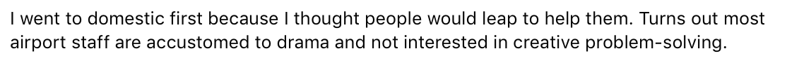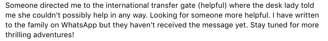 But now that I’m home I know that at that stage those HELP people could have been part of an international slave ring (all you really need is two bilingual people and a bit of sass—at that stage I didn’t know that they must have been vetted to have gotten into the immigration area. Uh, probably. I think we established earlier that I don’t really know how airports work.)