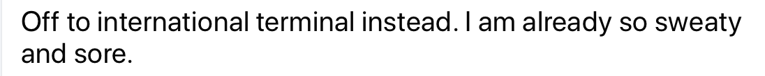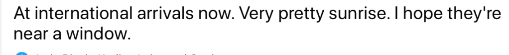 My phone is dying. It sometimes spontaneously mutes one or both people during a phone call (or just hangs up) and it’s having a lot of difficulty connecting to the internet. But I finally connected to Sydney airport’s free wifi and started live tweeting (except I live-tweeted on FaceBook, because shut up, that’s why. And yeah, I know they want us to call FaceBook something different now, but I’m a rebel).