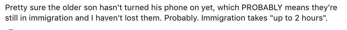 Another fell asleep as I tweeted that. I woke them all when it was time to go, and one raced off to the toilet—giving me one last thrill before we got on the plane because none of us had any idea where he was. But he knew what he was doing, and was quick. (So yes, I lost two of the six refugees even AFTER I nearly got them kidnapped. Shut up.)