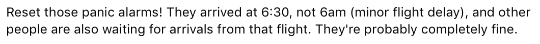 Lesson 4 for CRISP groups: Try not to have the most incompetent, absent-minded, and unhealthy person in the group meet the family at the airport by themselves. But you probably had that one worked out already.