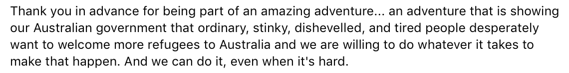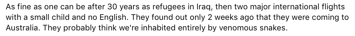 In the confusion, it took far too long to realise that the friendly girl-child belonged to someone else and the man and woman I spoke to were NOT new friends made on the plane but two staff members of an extremely important refugee advocacy organisation that I’ll call HELP because although they did everything right I don’t want to draw any possible negative attention to them (that would be very bad for everyone). They are the government body that meets refugees at the airport in Sydney, arranges their accommodation and food, and looks after the family for 12 months.