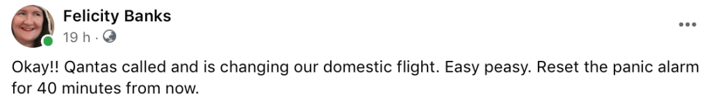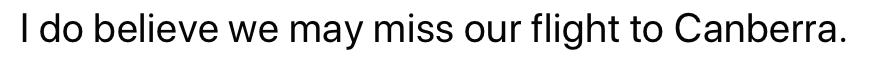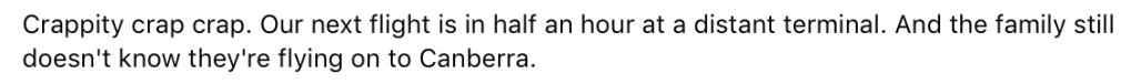 I had already called three CRSA people…. and got three answering machines. They had already been told that I’d fixed the latest disaster (missing our flight, for those who have lost count) and we’d just take a later Qantas flight. They had no reason to think anything else would go wrong—or that I couldn’t handle it.