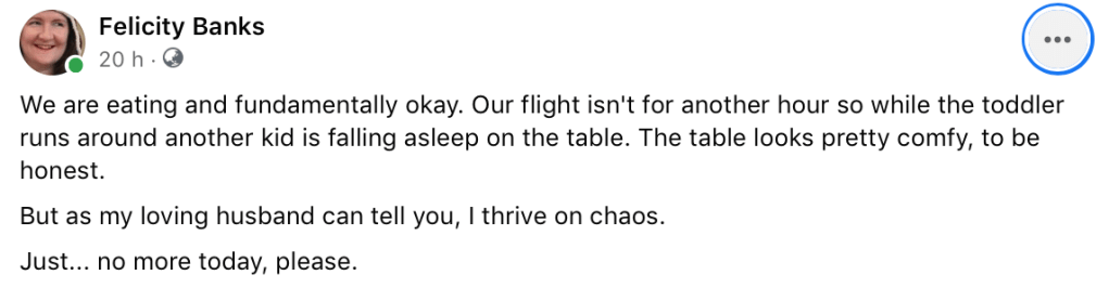 I found out Cat was on my flight when I was gazing blearily at the board to see which gate to go to and her husband Mike (also a friend) walked up beside me and said, “I believe you’re going to Gate 1C.” He’d been watching the entire saga unfold on FaceBook.