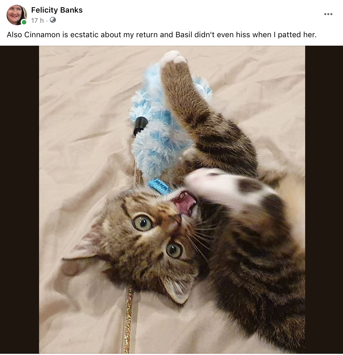 This is Cinnamon, who is 100% a Cinnamon roll even though he is the author of all the minor scratches on my hands (from when I first caught him as a feral… two weeks ago).