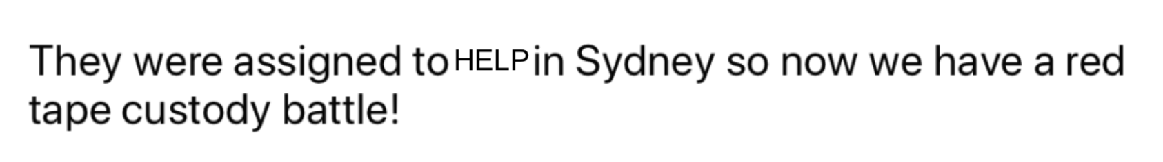 HELP had short-term accommodation prepared (a LOT nicer than ours) in Sydney, with food already there and transport arranged and a twelve-month plan laid out to settle the family in Sydney.