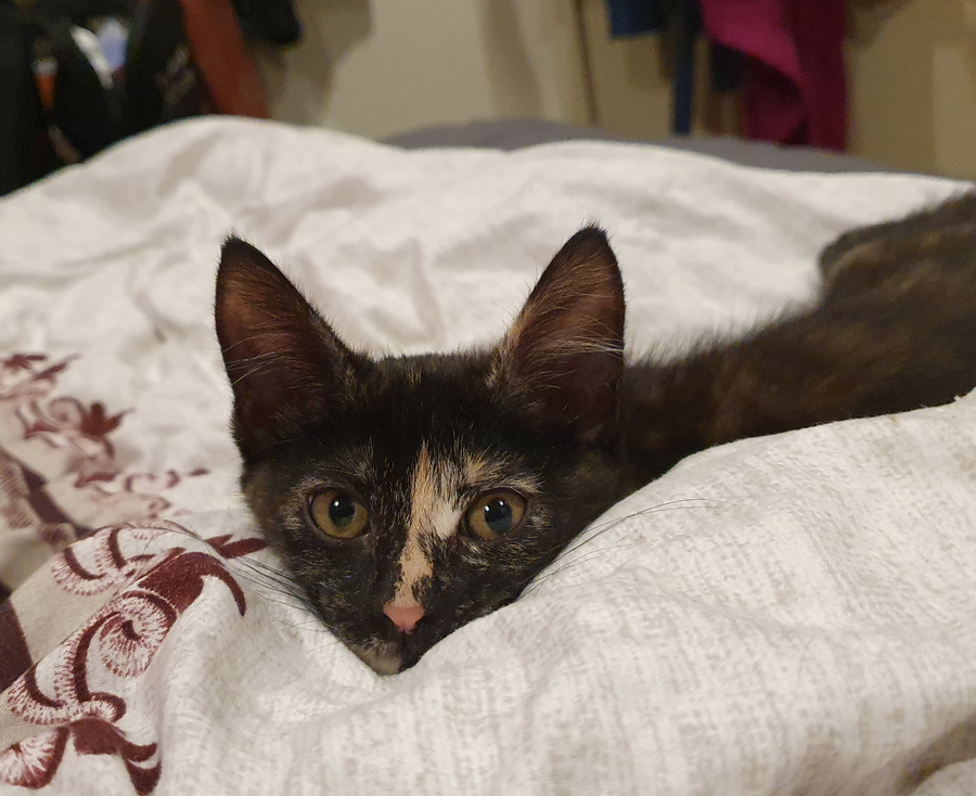 Dawn (900164002269084) is a female tortoiseshell who purrs like a supercar and demands focused pats when I wake up in the morning. She loves climbing, boxes, and destroying things. Do not leave your toilet paper unsupervised! She is desexed and has been vaccinated twice. She is open to friendships with dogs and older cats. She loves belly rubs but/and is likely to wrap her paws and teeth lovingly around your hand. She gets on well with Caramel and doesn’t like to be alone.