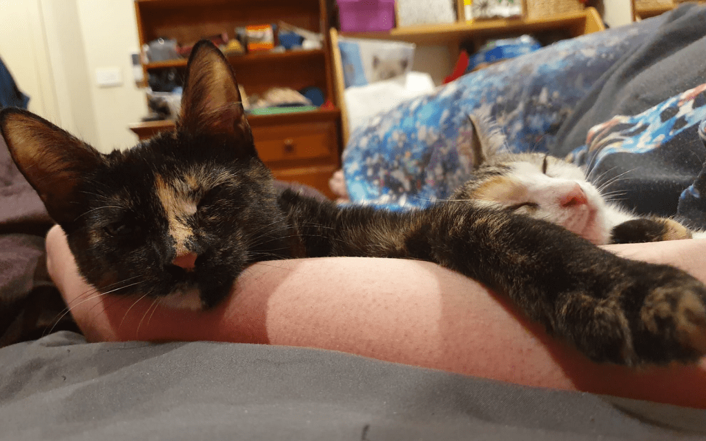 They naturally fall into the very close bonded pair of Curly Wurly and Violet Crumble (both desexed boys, chipped, and double vaxxed); and the newly-friendly duo of Dawn and Caramel (both girls who are chipped and double vaxxed but Caramel isn’t desexed yet, mainly because I simply didn’t have enough money).