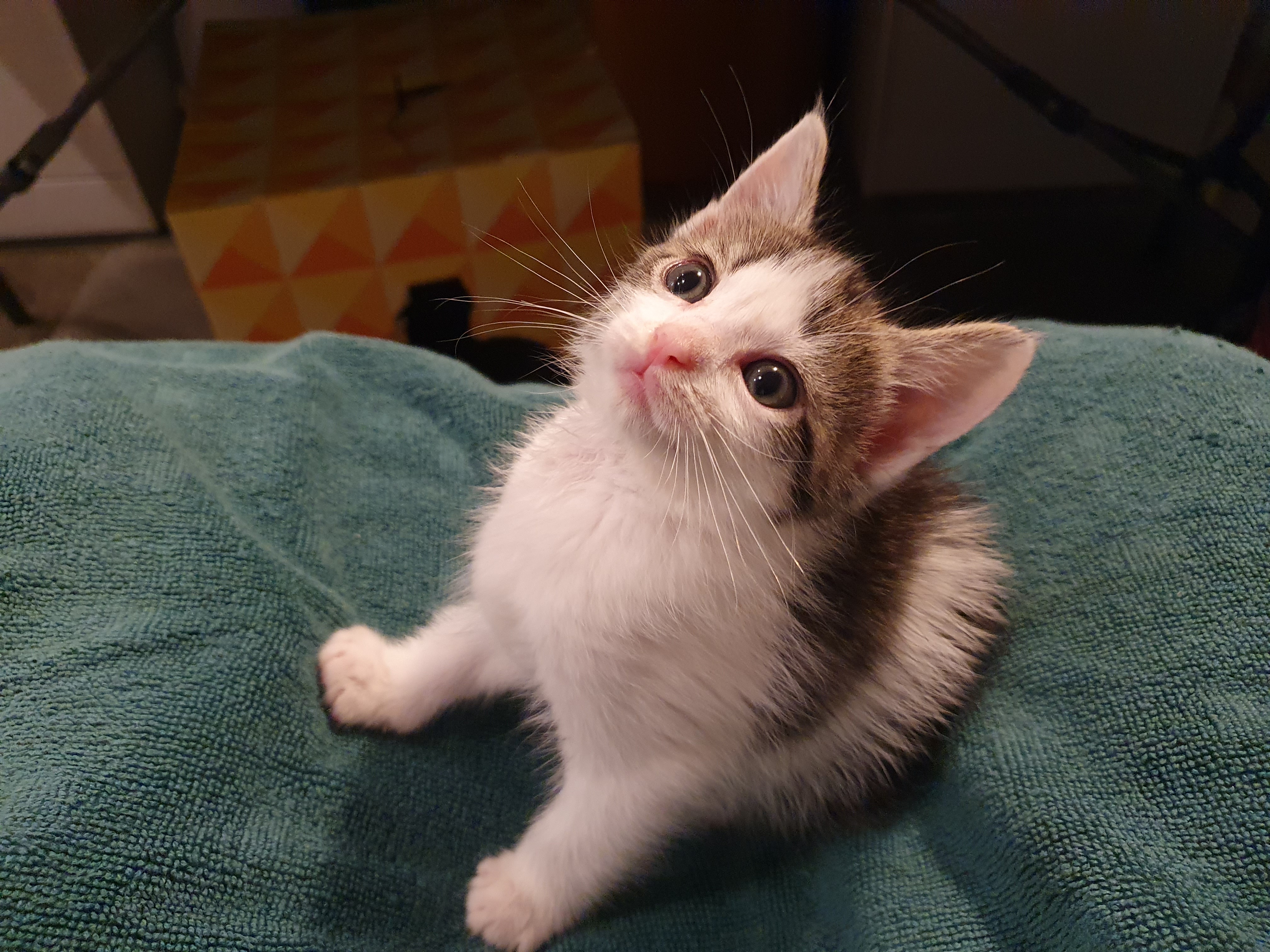 In Spring, with no fosters left, I helped another rescue organisation by taking on four of their kittens: I named them Squirrel (fluffy tortoiseshell and white), Bunny Rabbit (her sister, a tortoiseshell very much like Dawn), Meeouse (white), and Monkey.