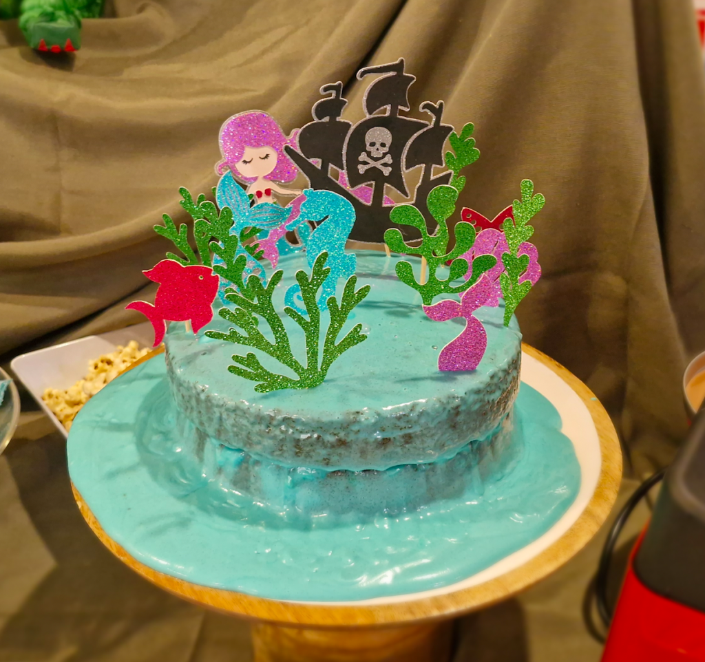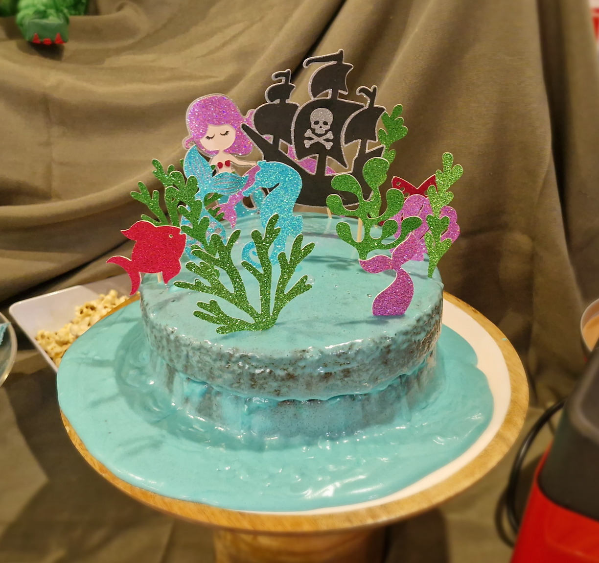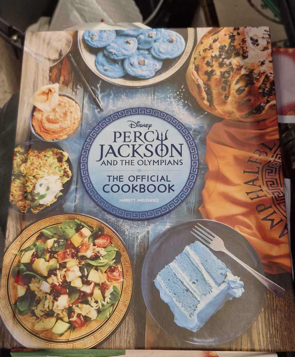 There’s an official Percy Jackson cookbook and it’s incredibly good. We’ve literally made twenty-seven of the recipes, and there are several that we make over and over. The “Blue Velvet Cake” is really nice, so I cooked that (yes I screwed up the icing slightly). As you can tell, that’s a mermaid/pirate set of cake toppers. There are pirates and sirens in the books, so that works great!