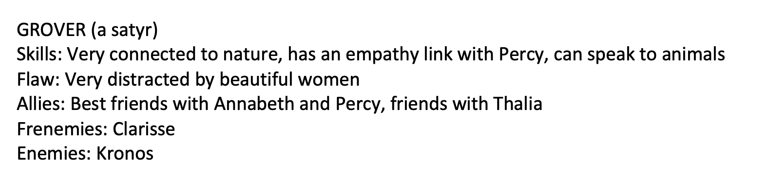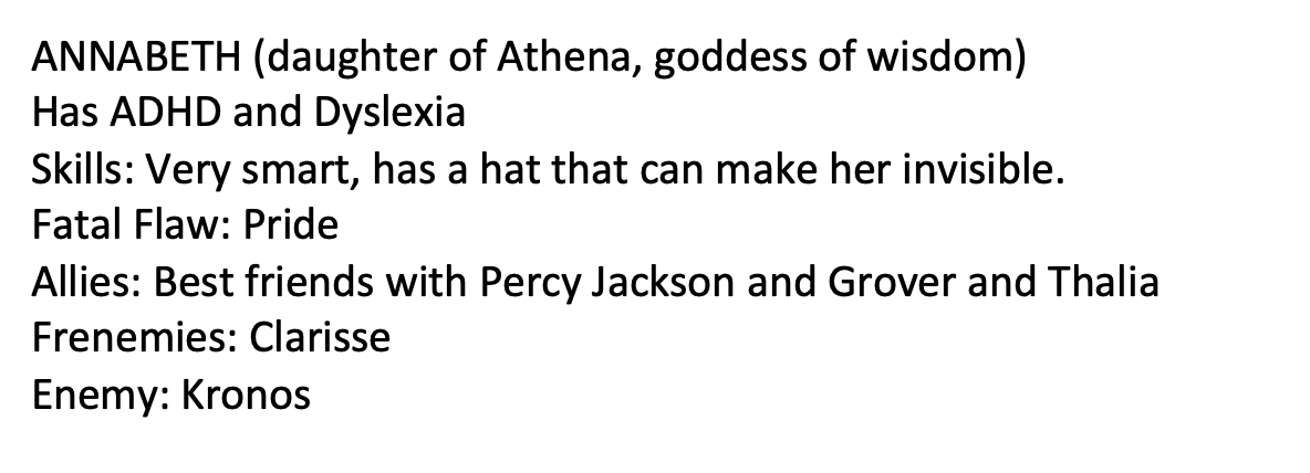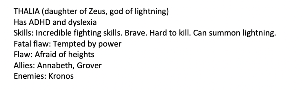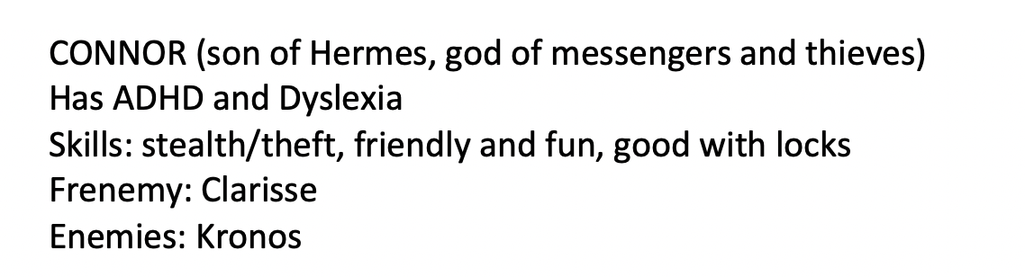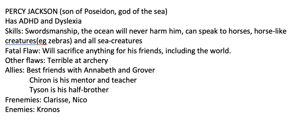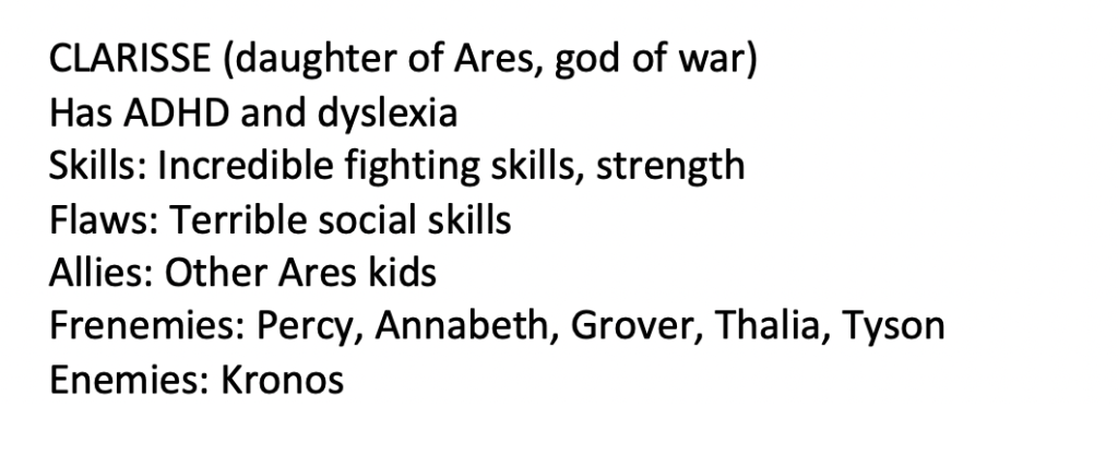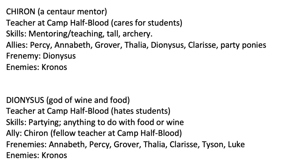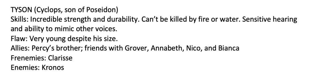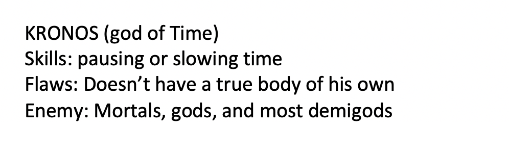 AND I chose to also write up Kronos, the big bad of the first five-book series. I knew one of the kids was super confident and would enjoy being a villain (including being targeted and “hated” by every other kid at the party).