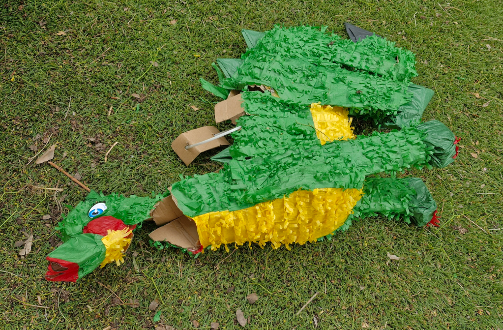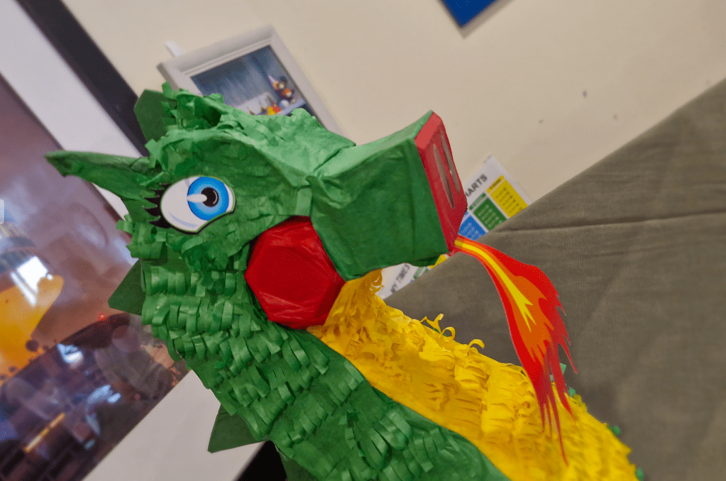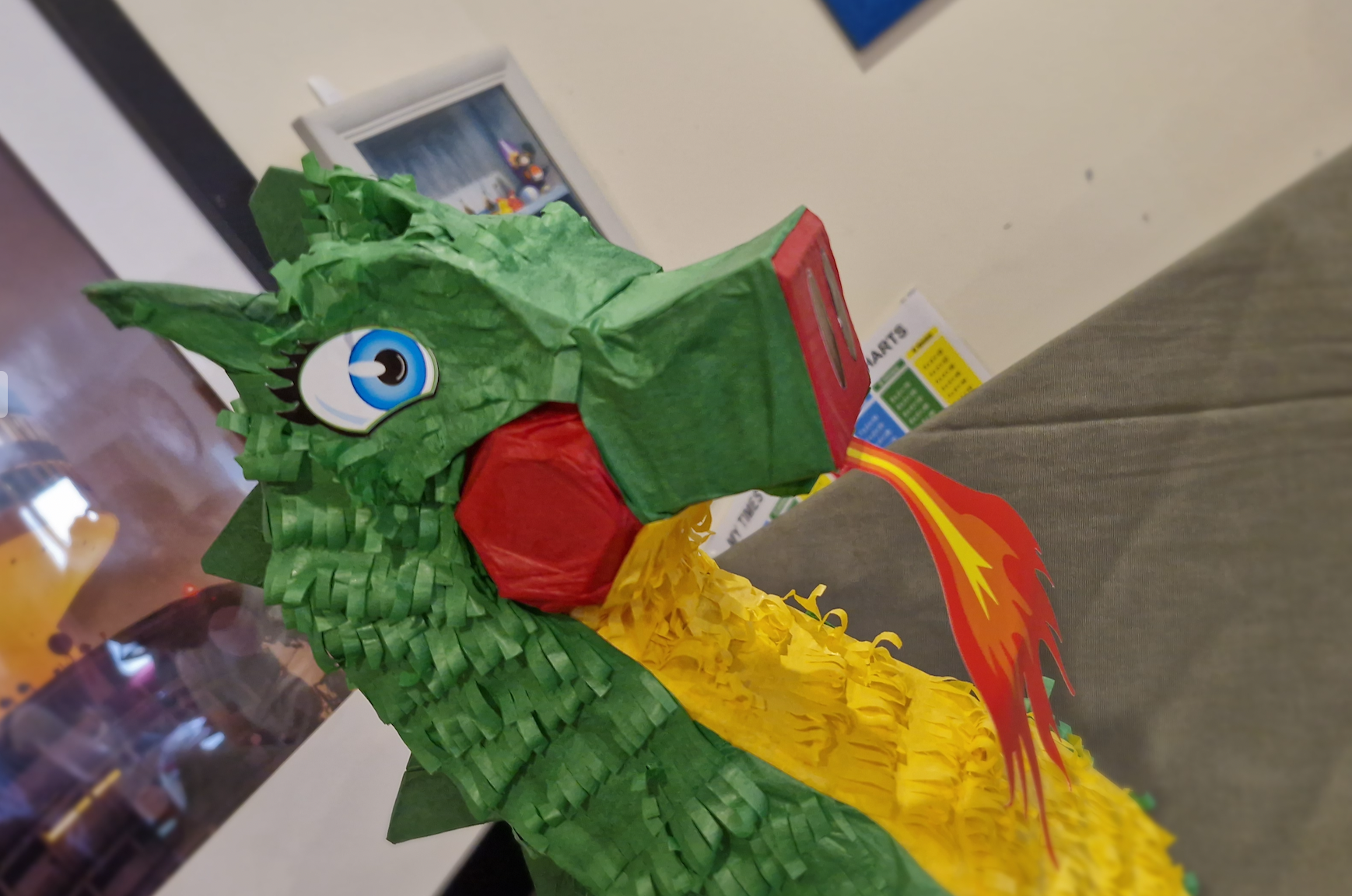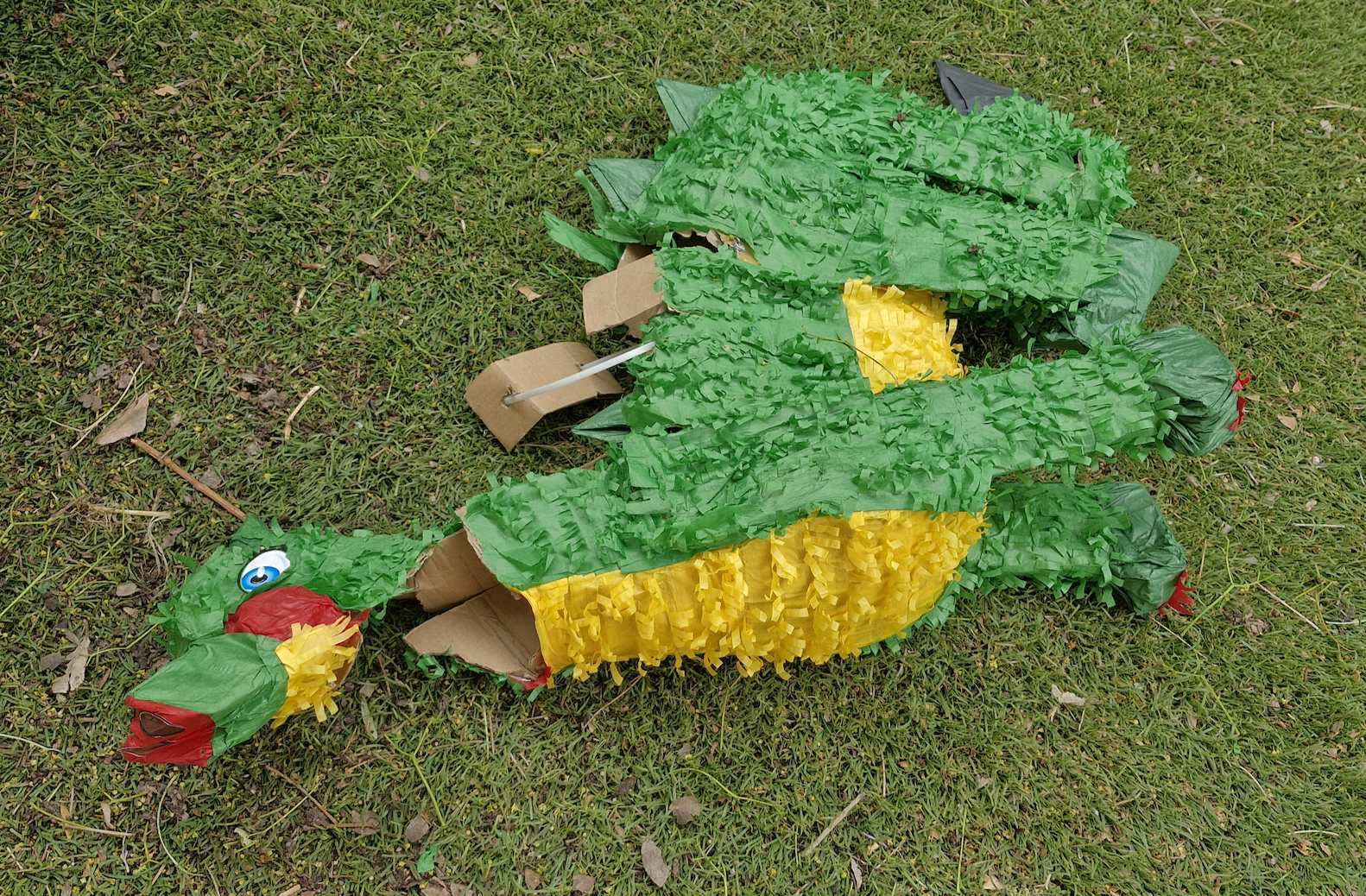 I ordered a dragon piñata online (from ebay for $30), filled it with individually-wrapped lollies and put in a key I cut out of a piece of cardboard.