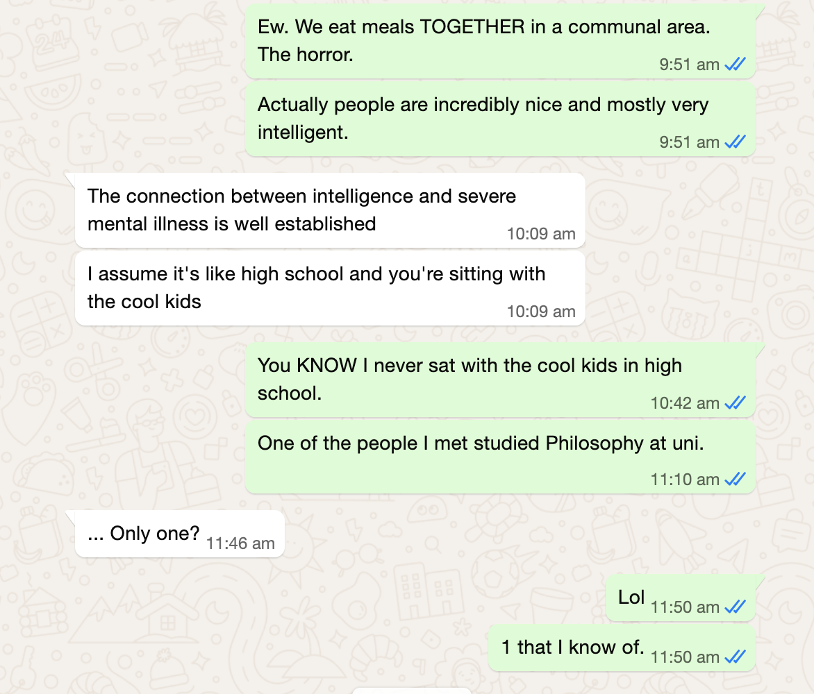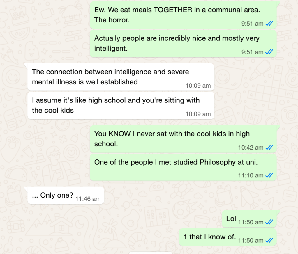 I finished my breakfast—I hadn’t brushed my teeth or showered since I arrived, and I wasn’t wearing a bra—and went back to my room rather impressed by the innate optimism of having psych patients talk to each other without supervision. Also impressed and delighted by Hannah and Mei.