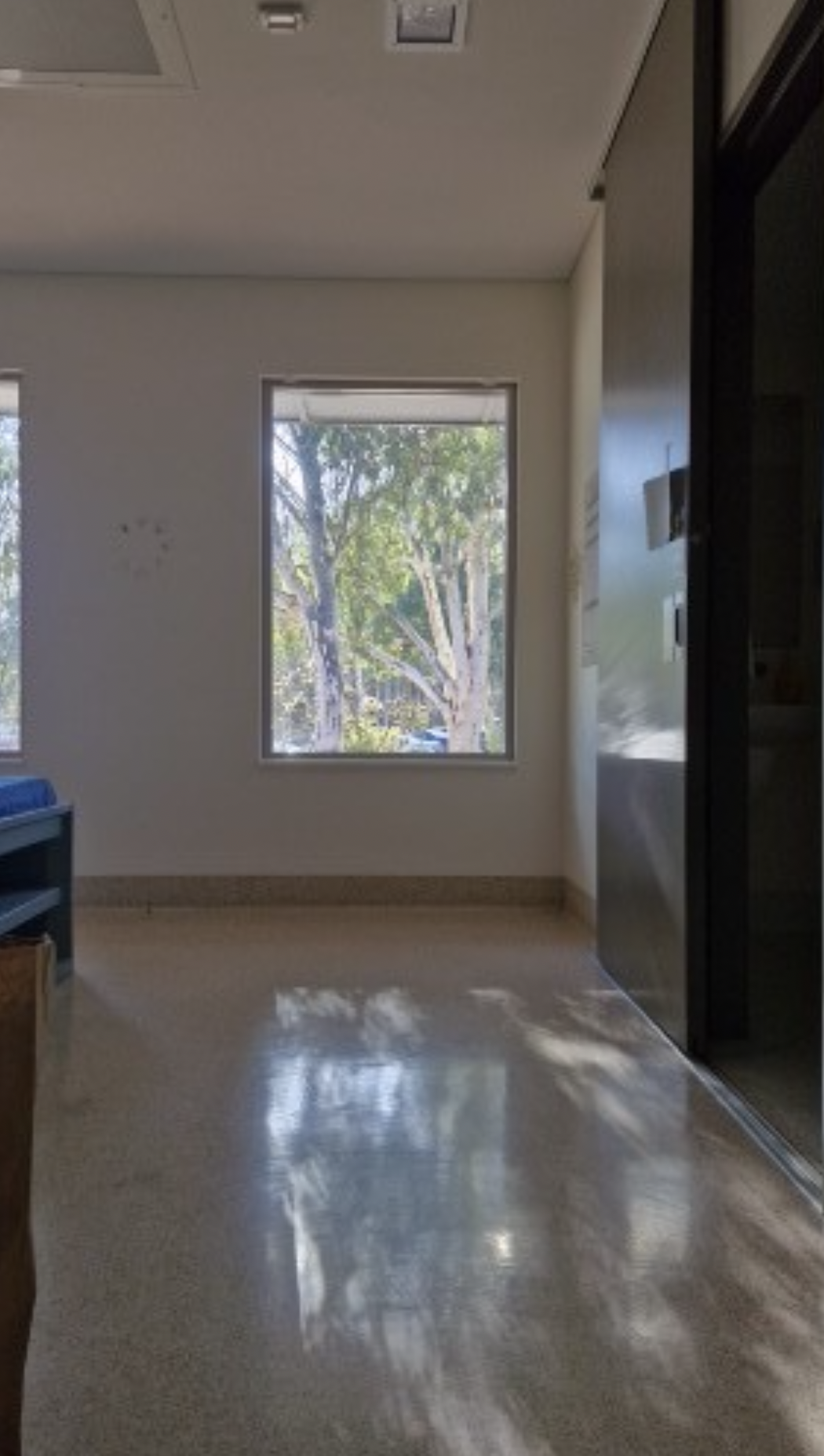 Over that first weekend my mood shifted all the way over to manic and I was (sort of) having a lovely time. Without the need to supervise my family (much—I was still reminding Chris of things and checking in on his tenant-prep progress, which was impressive) I could sleep when I wanted (other than meal times), read as much as I liked, daydream, and so on. If I felt social, I could walk out to the lounge and there’d always be someone there. I could wheel my bed away from the wall and then lie down and see this view, which I very much appreciated: