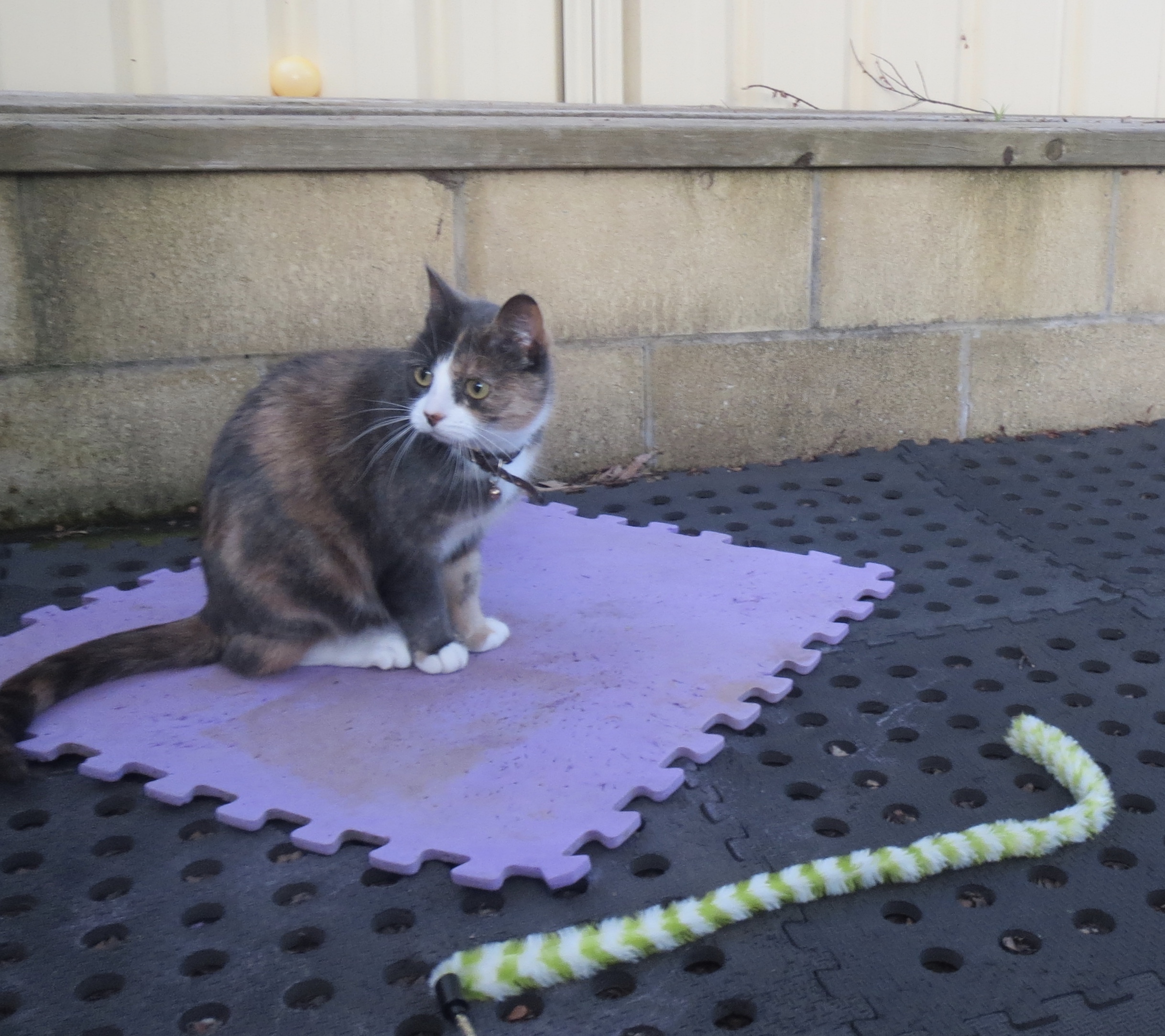 Clearly, teaching her to walk on a lead is an excellent plan. So today I put the harness and lead on her for the first time, and managed to walk her from the living room to my room and back again, and I opened the back door to let her out (on the leash). It was a couple of minutes, but she handled it really well—most cats simply flop to the ground and refuse to move. She walked—walked, not ran. I was easily able to pace myself to her, and since she knows her own name (or thinks it means ‘food’, which works just as well) I was able to get her to follow me a little.