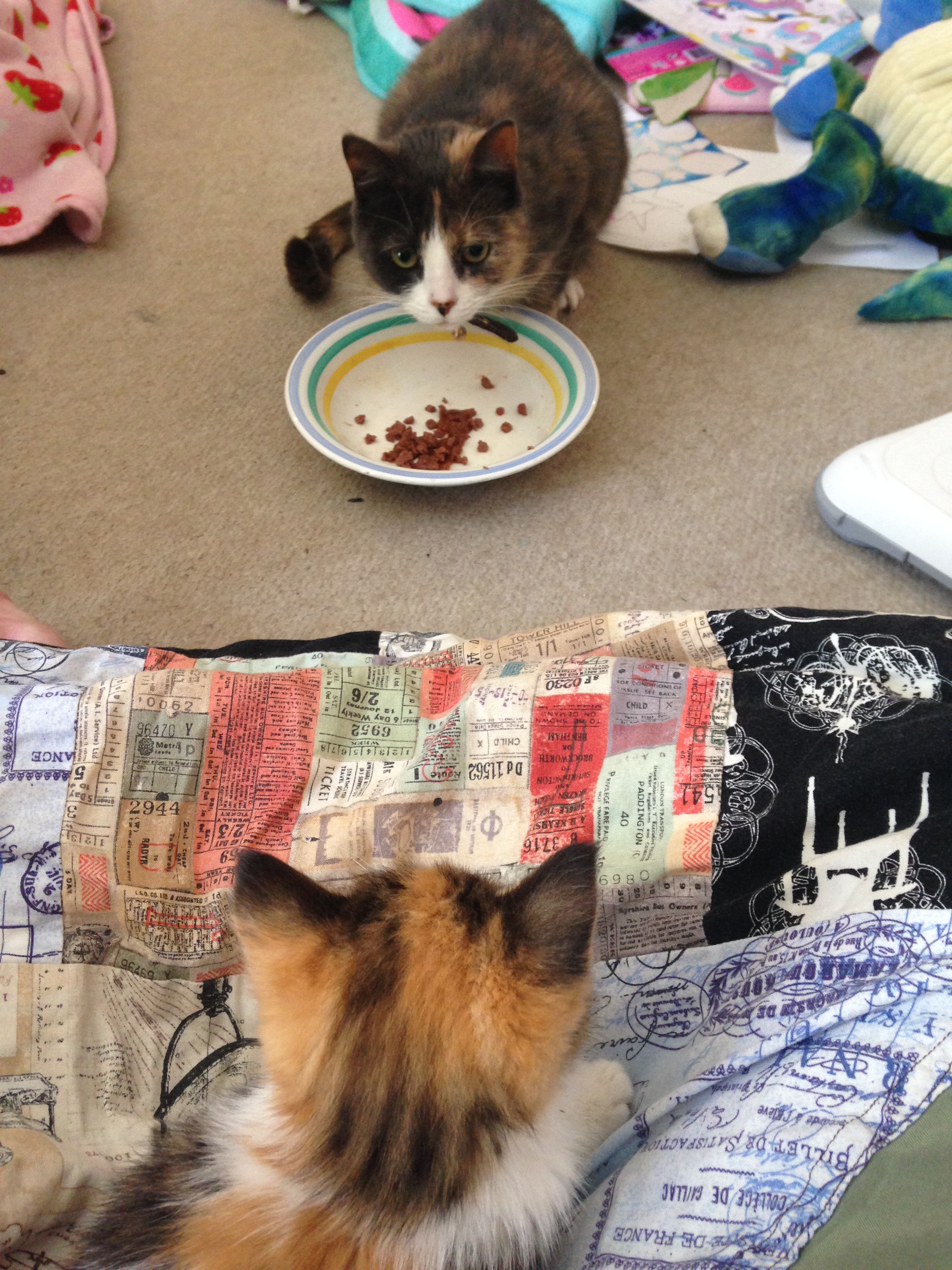 Meanwhile, Zoom is desperately hungry. I just started transitioning her to a teensy bit of high-quality regular cat food (both wet and dry) along with her plain chicken, and feeding her more often… but she wants more more more. I need to put her off for now, even though she’s legitimately hungry, because her stomach is still very sensitive. I also tried feeding Zipper and Zoom next to each other (it’s supposed to give them positive associations with each other) which was an utter failure as Zoom wolfs down her food and then runs to eat Zipper’s. The first two times this happened Zipper warned her off and she subsided. After that I fed them separately, which was very difficult as I’d have to prepare both dishes, then put Zipper’s down and carry Zoom to the next room… which she did not handle gracefully. And on one occasion I made the mistake of letting Zoom out of my room when she was finished eating… but Zipper was not. Zoom charged right for Zipper’s bowl and Zipper baulked and fled.