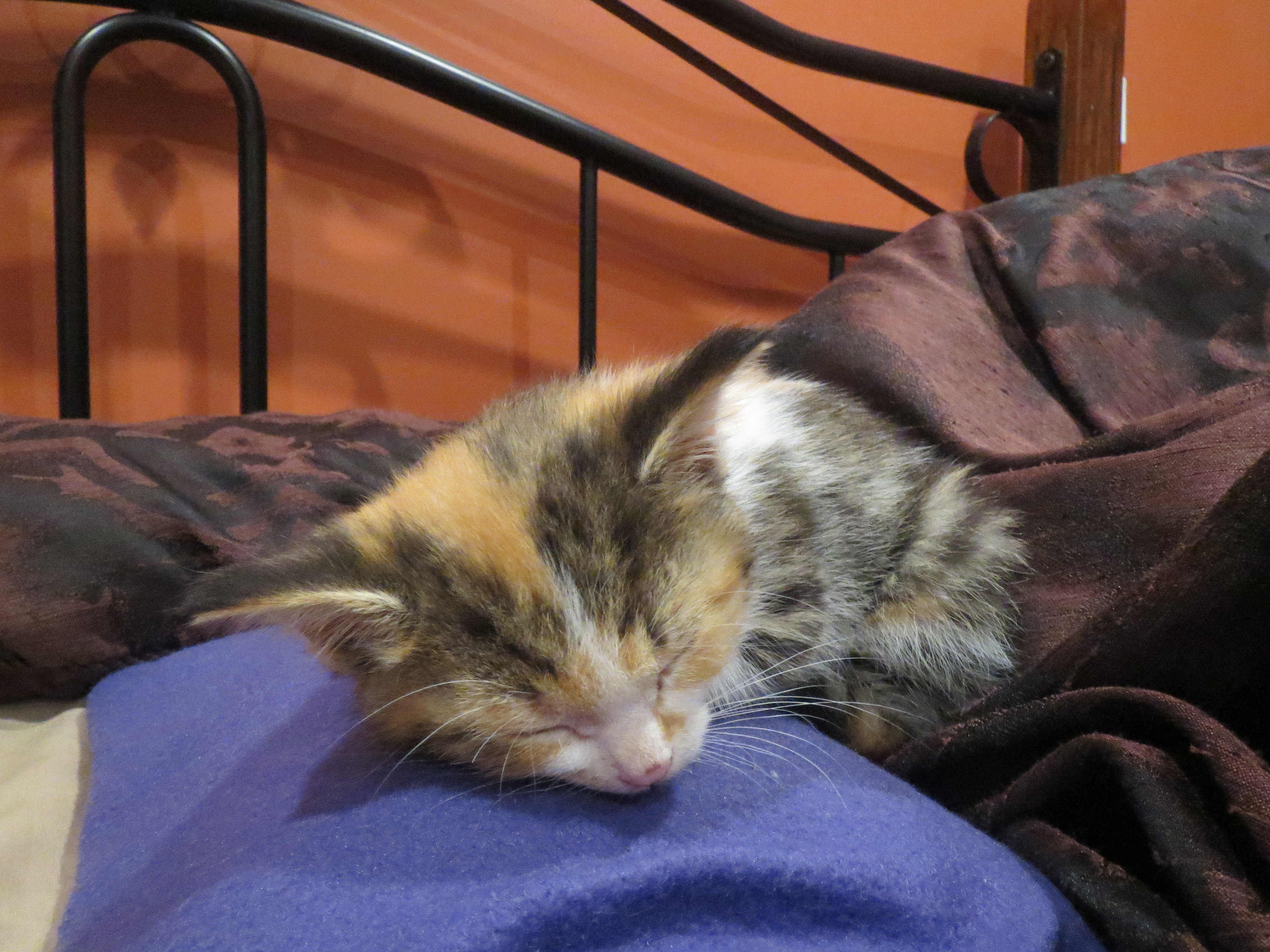 I fed Zoom four times altogether yesterday. She polished off the first two meals, ate some of the third, and refused the fourth. Around 2am, she threw up again (not the food, but the white foam that indicates stomach issues), so I reduced her feedings to half a teaspoon three times today, and that seemed to work well. We’ll see if she throws up or shows any other signs of distress overnight.