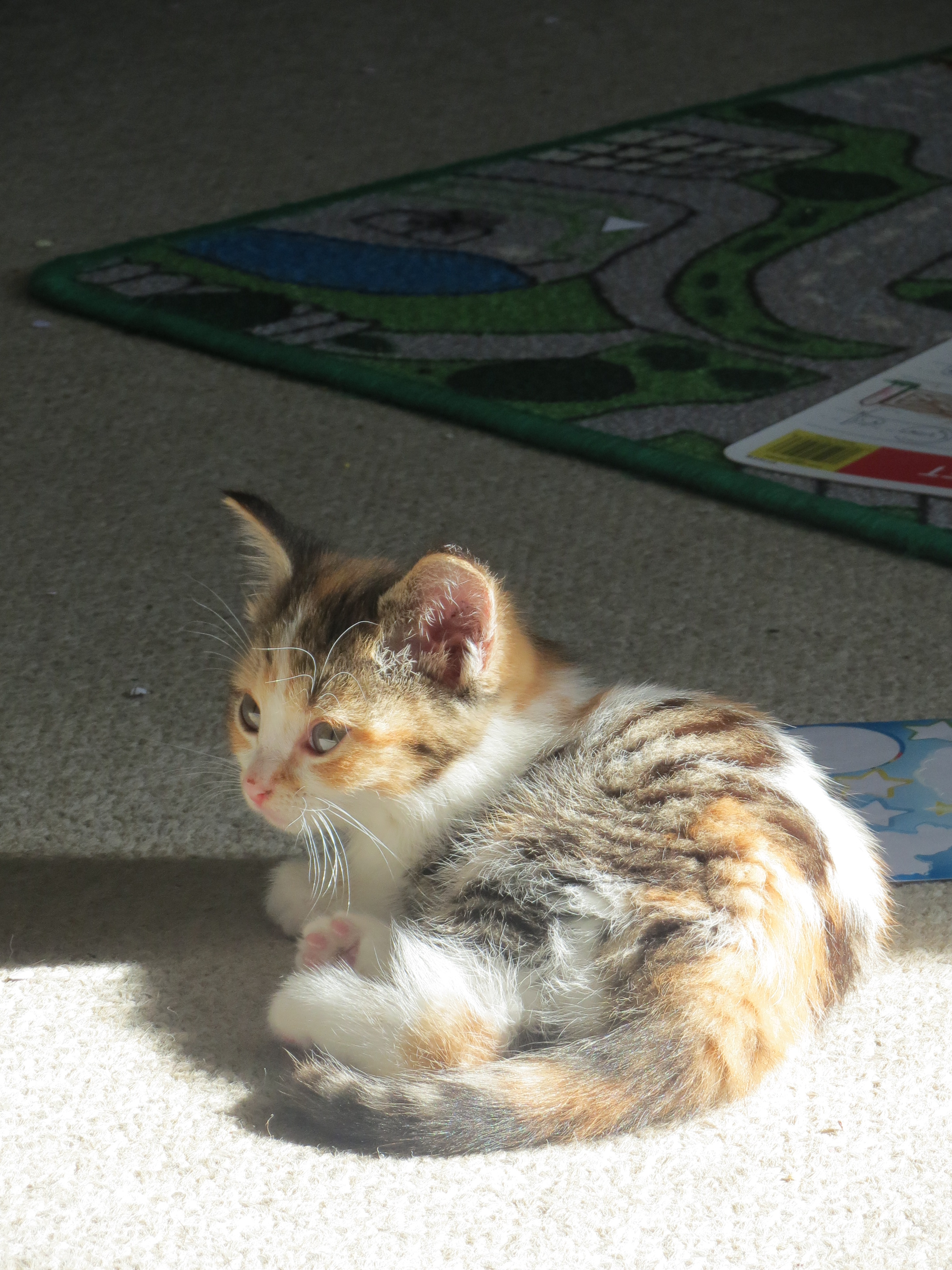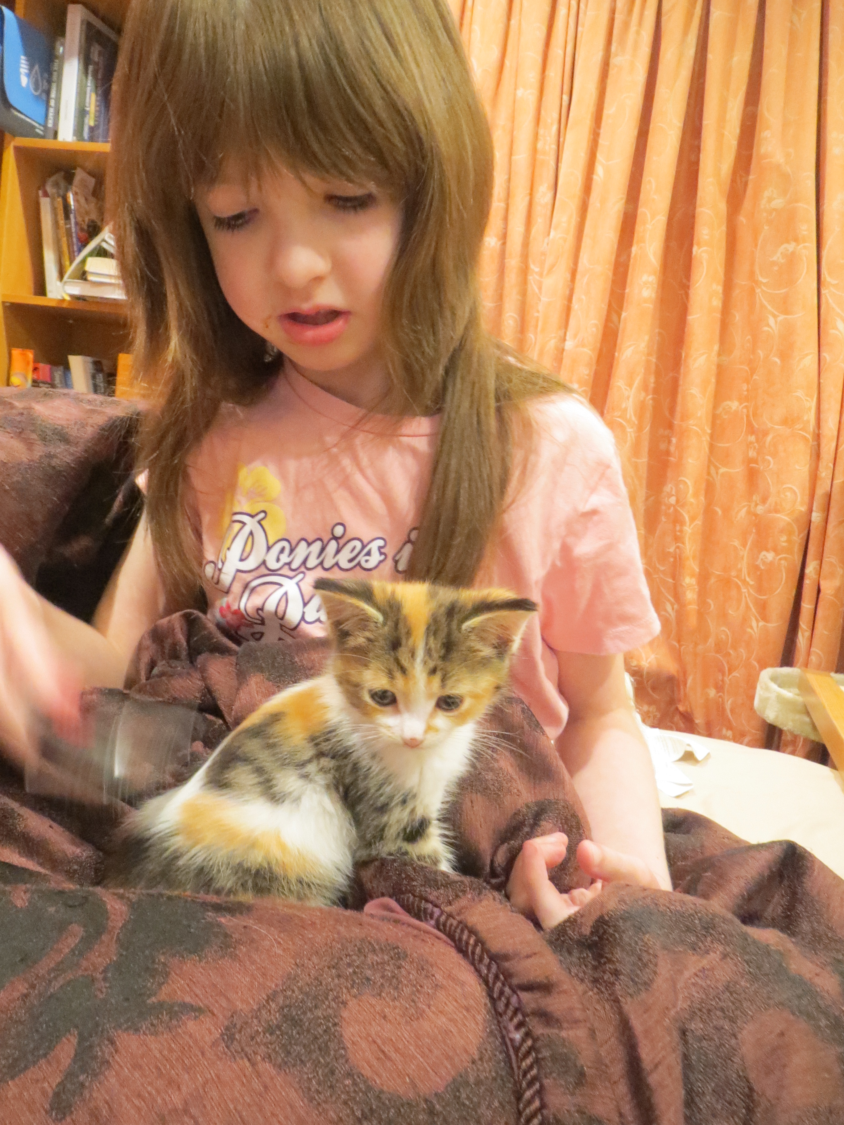 So today we were using our disciplining techniques a lot for the first time—that is, saying “No” in a deep (not loud or it could hurt her) voice, tapping her on the nose with one finger (it makes cats blink and they hate it, but it doesn’t cause pain) and often physically moving her away from whatever she shouldn’t be getting into.