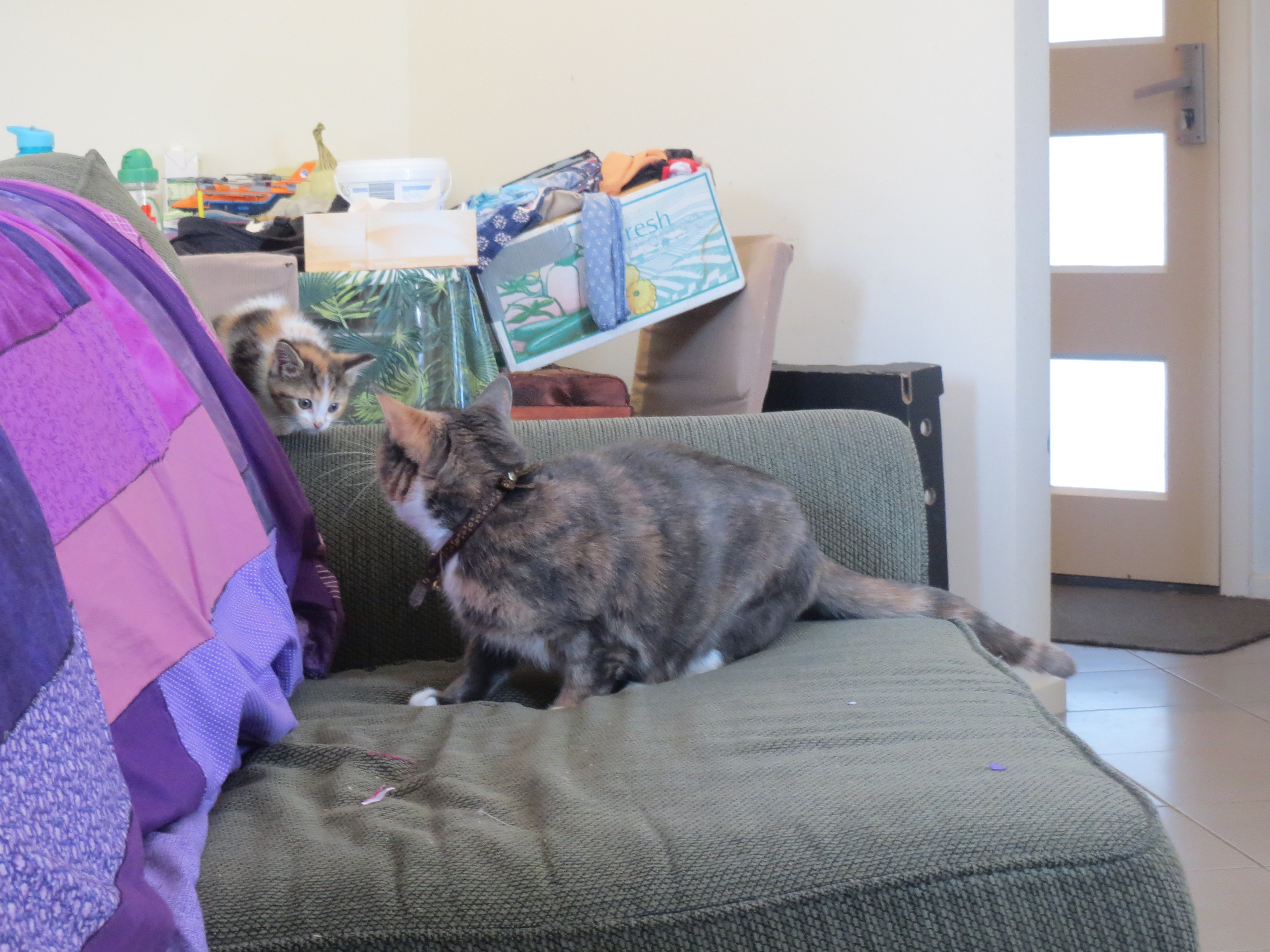 She and Zipper did chase each other last night, as I predicted! Well… a bit. Zipper is still stalking Zoom, but doesn’t dare actually make physical contact, so when the moment comes to attack she jumps out next to Zoom and then runs away. Which is hilarious. At one stage, Zoom was drinking some water and Zipper managed to creep up and sniff the very tip of her tail. That was their first point of actual physical contact.