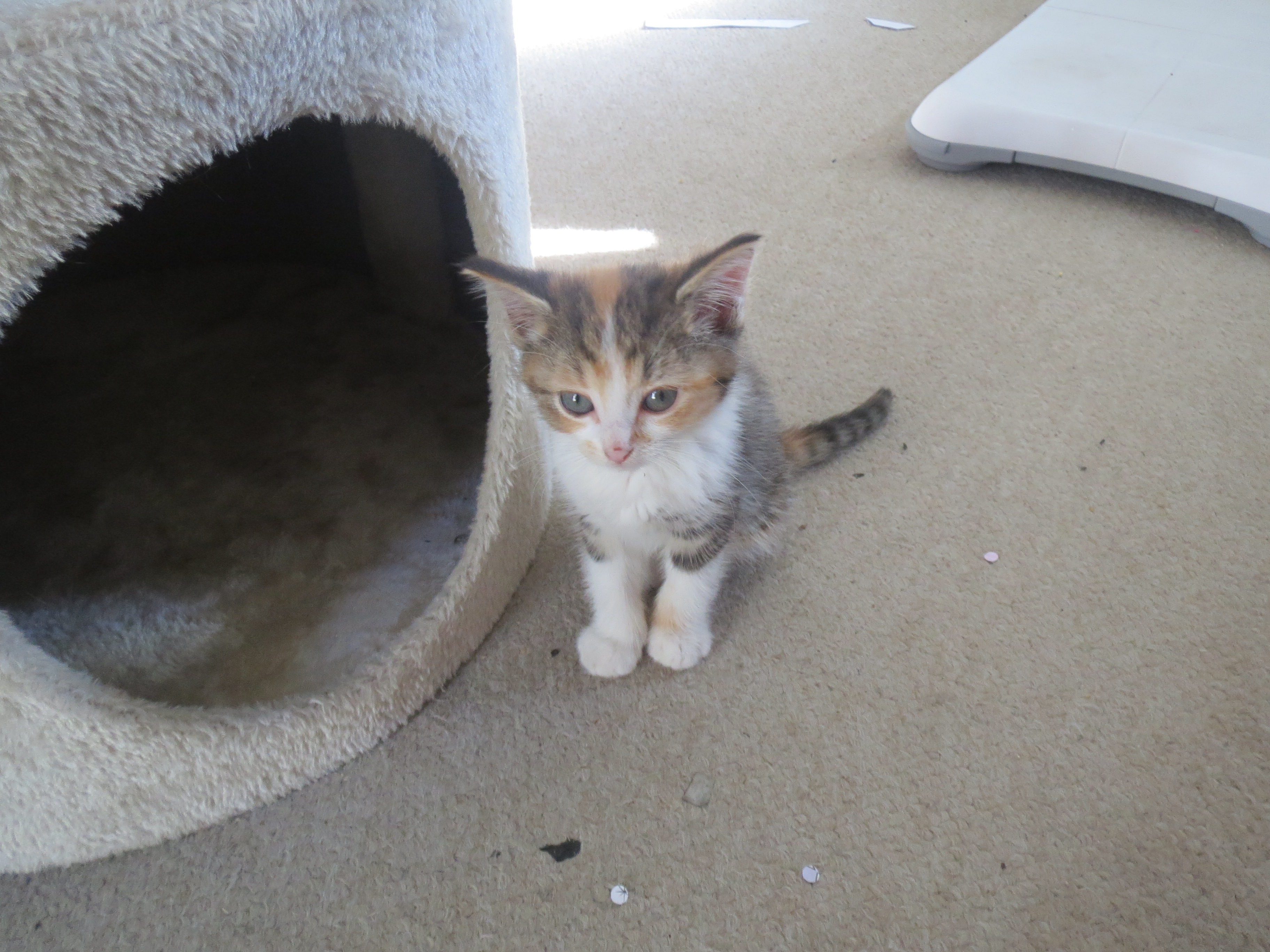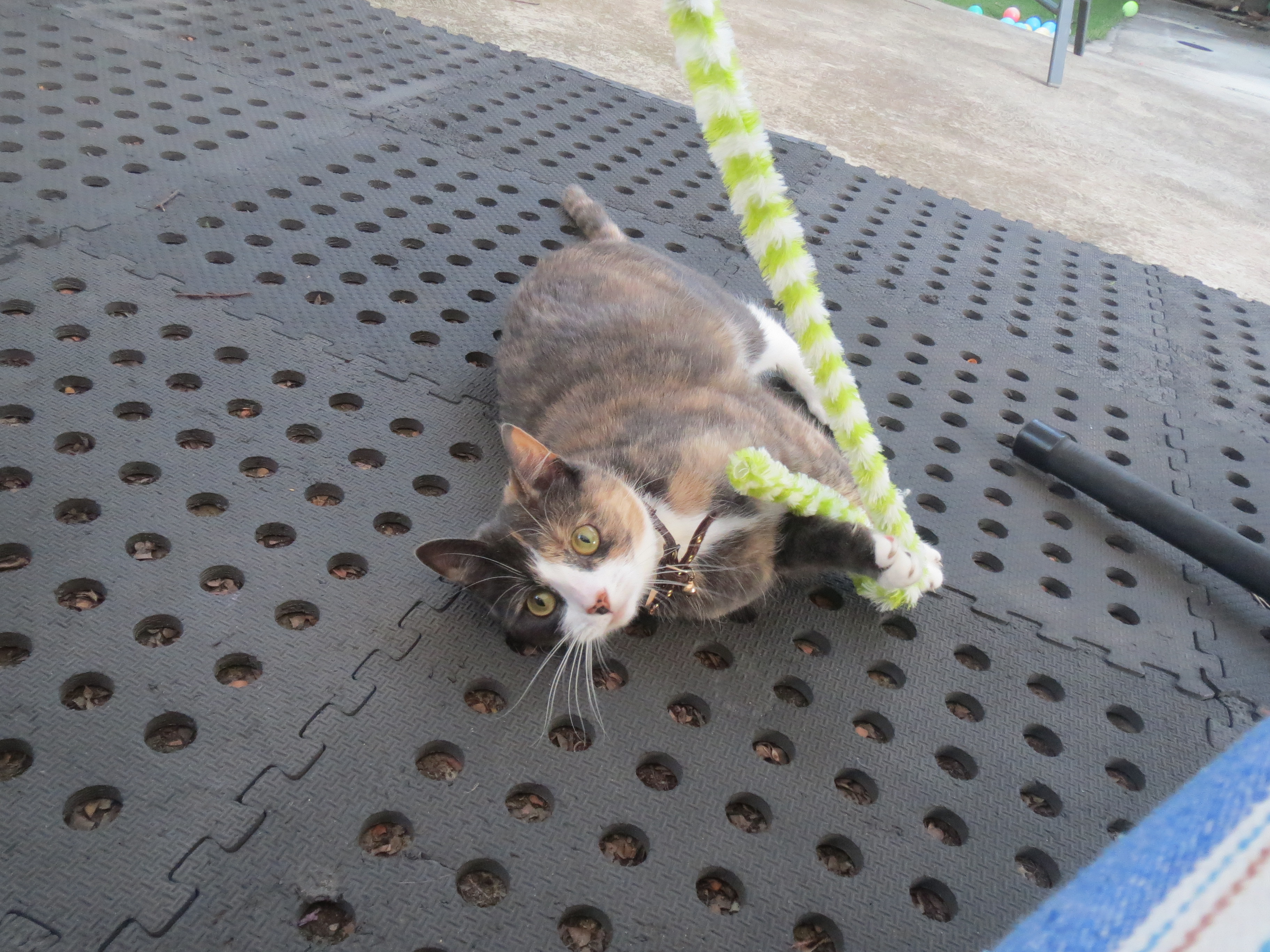Zoom is enjoying her cat toys, while still wanting to attack us delicious humans. She’s still having accidents outside the littler box, but they seem to be in the bathroom… so at least they’re close?