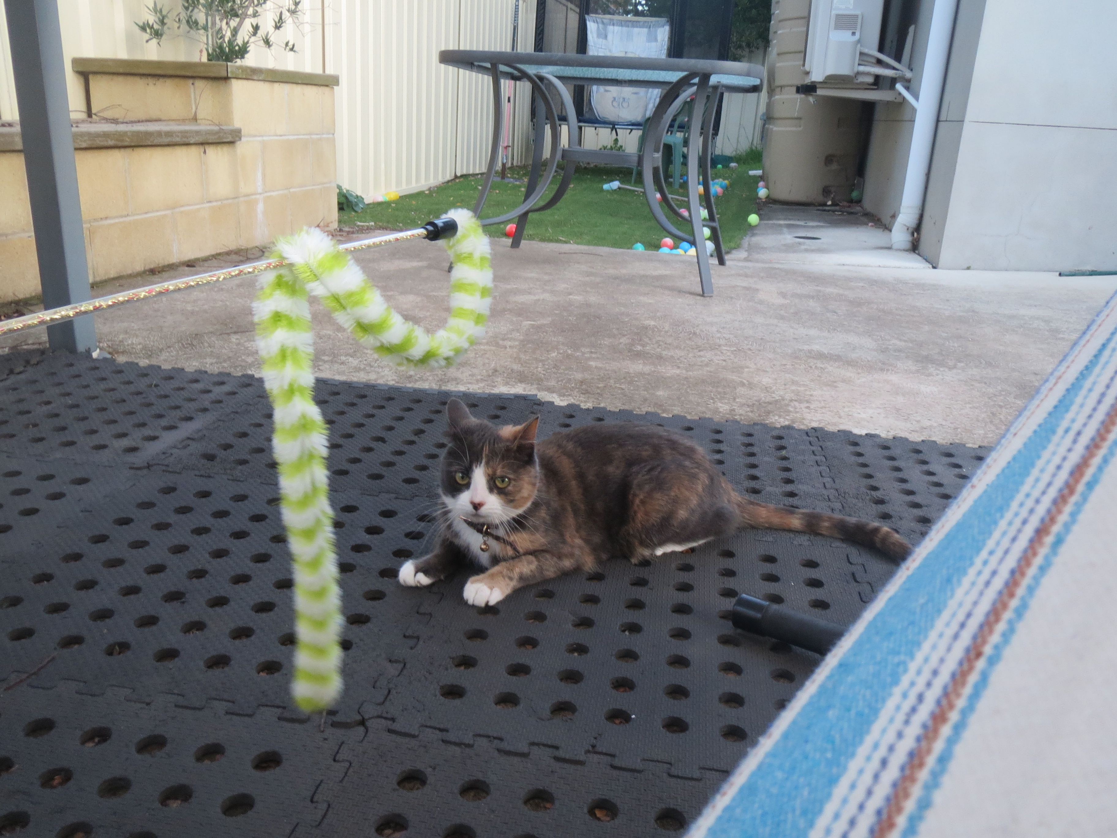 Things are moving quickly today. Zoom now has a collar (which had to be cut down considerably), which should help people know she’s owned and loved if she gets away. So if she gets away and if I can’t lure her back and if she doesn’t come back quickly on her own… we should be able to find her via local community groups or vets or the RSPCA. It also helps us (and Zipper) have a better idea of where she is if we can’t actually see her.