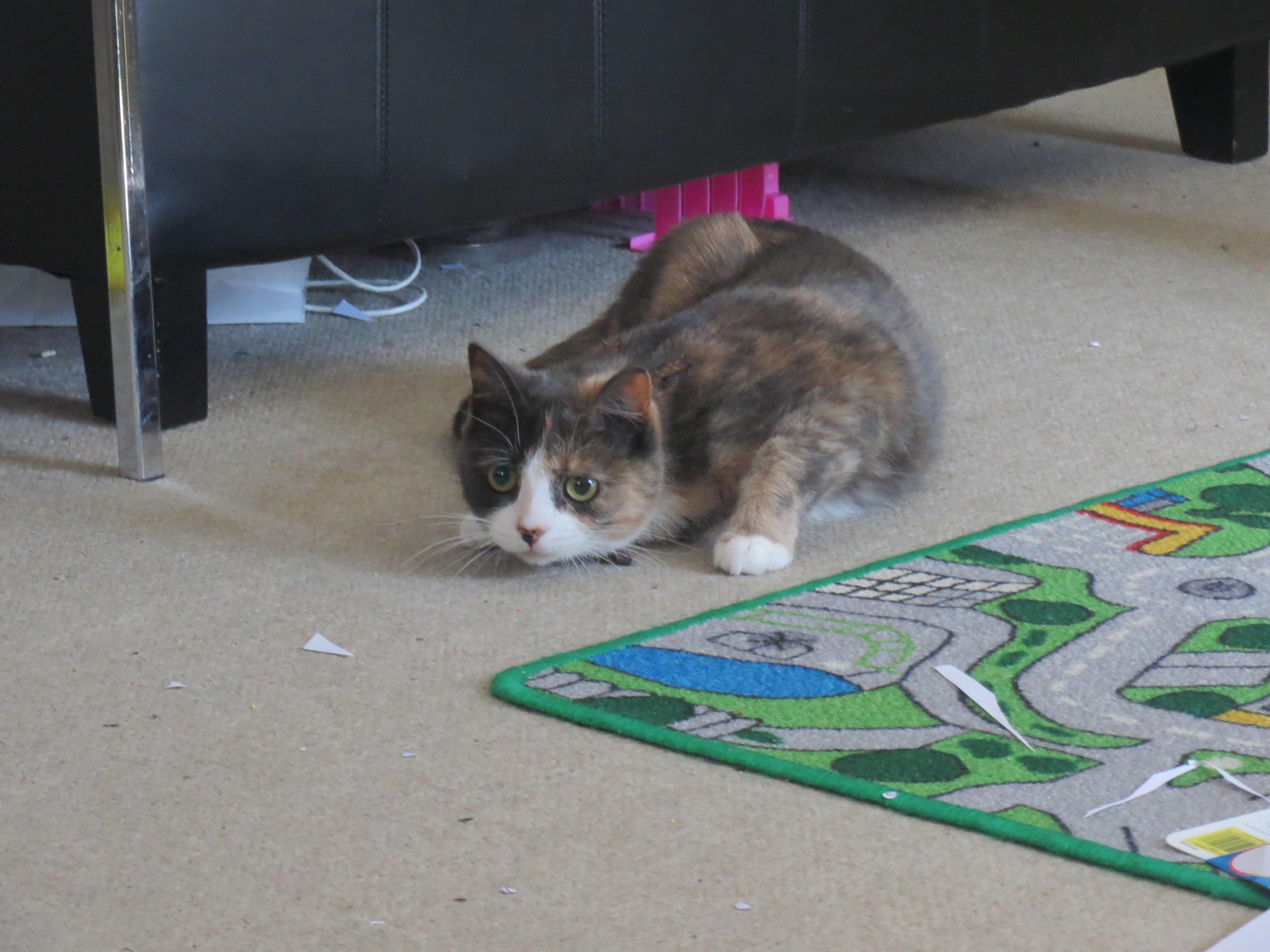She’s getting more playful as she feels better, and now gets quite loudly lonely if I leave the room, so I’m taking her into the living room more and more. She’s also curious about Zipper, and Zipper is getting more used to her too. Zipper’s attitude is now mostly, “What have you stupid humans done now?”