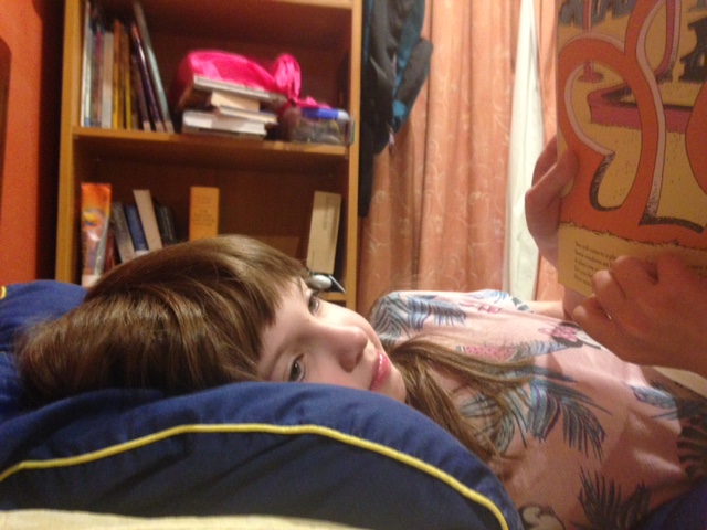 I’m too lazy to look up the term outline of subjects that my kids’ impressively organised school emailed out at the beginning of the year. But I did get Louisette to read with me yesterday, which is just about the best thing to do with any kid. (If you’re one of those parents who gets their kid to read to them every day, you’ll do fine with home schooling.)