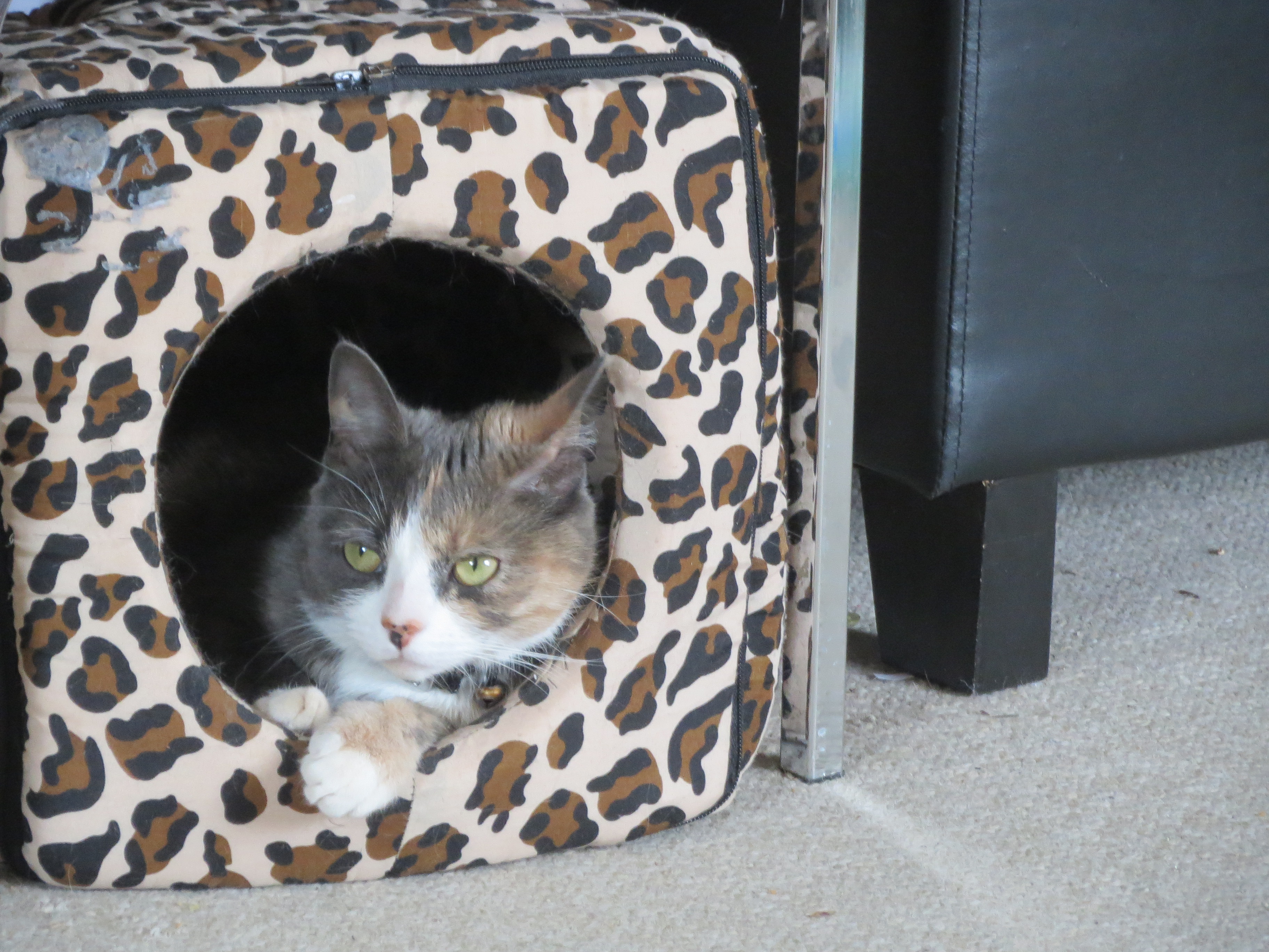Zipper has three main expressions. First is her, “I despise you” expression, which you’ll see in most photos—and indeed, most of the time in real life. She has resting feline face, that’s for sure. Second is her, “Ah, poor me! I’m starving and trapped! Please have pity on meeeee!” which is the face she applies when she would like me to check her food level (it’s easier to have me check it than to bother doing it herself) or open a door (why YES she has a fully functional two-way cat door that she is perfectly able to use). The third is the expression above, which I call, “Medieval maiden disturbed while bathing in a picturesque pool in the forest”. She is beautiful, and wishes to be admired, but is far too classy to actually let people look directly at her without being offended. So yeah, she’s a cat.