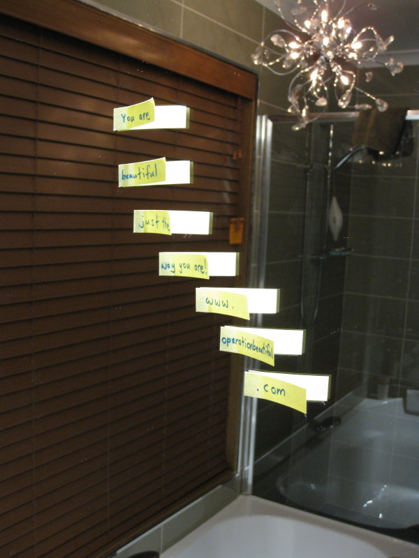 Today’s awesomeness is S#47: Participate in Operation Beautiful. You can find details at operationbeautiful.com. I posted these notes on my mum’s bathroom mirror: