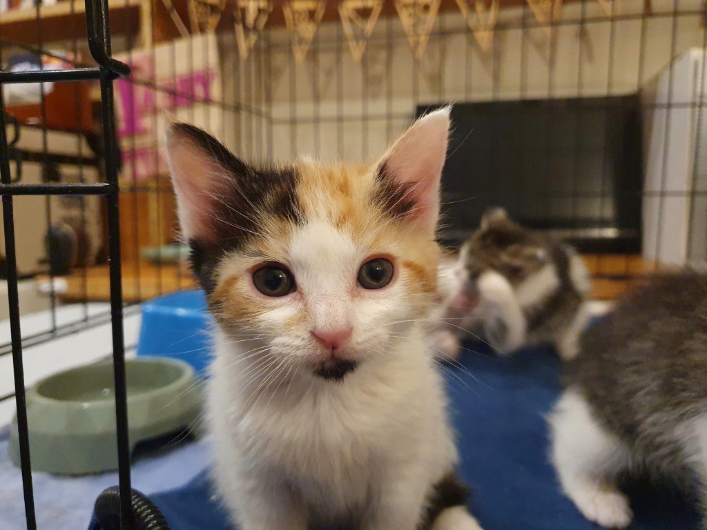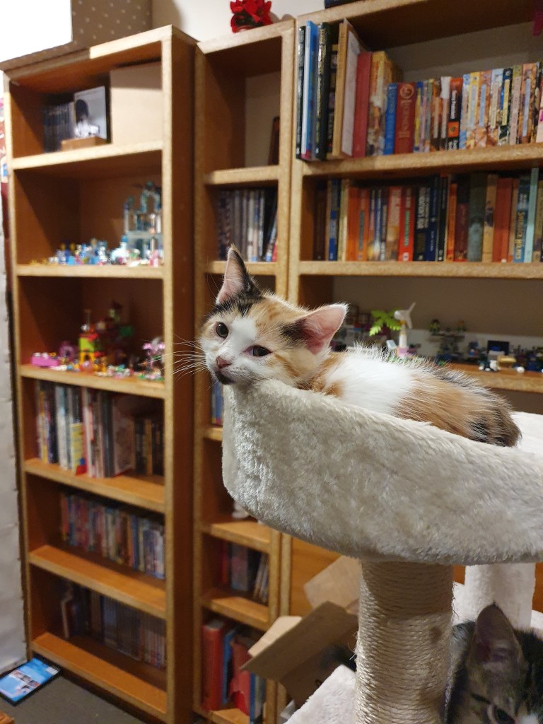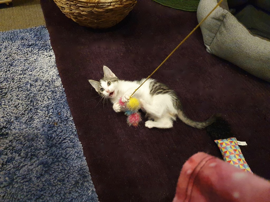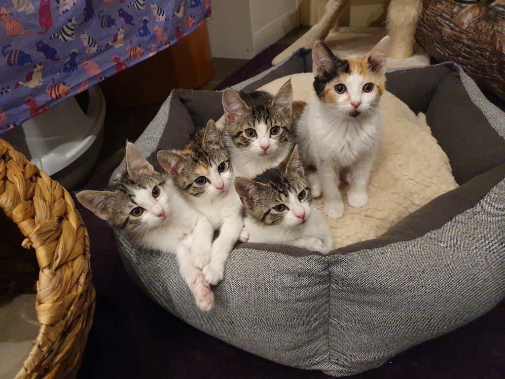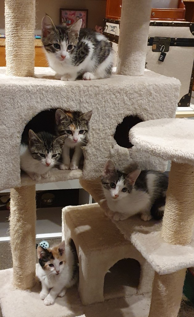 In Spring, with no fosters left, I helped another rescue organisation by taking on four of their kittens: I named them Squirrel (fluffy tortoiseshell and white), Bunny Rabbit (her sister, a tortoiseshell very much like Dawn), Meeouse (white), and Monkey.