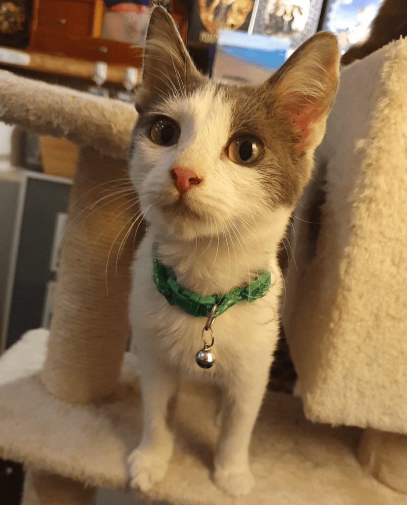 Buttons was adopted into a family of experienced and undaunted cat owners.