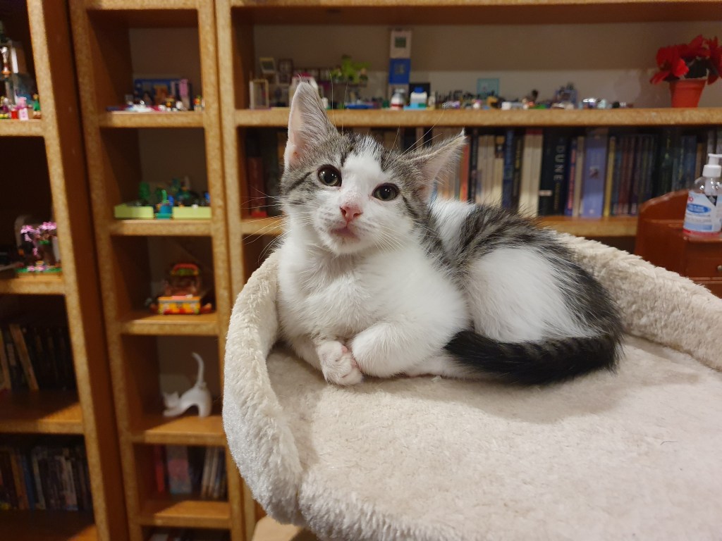 Popcorn was the first member of the Snack Pack to be adopted. She doesn’t hiss or spit any more, but loves to purr and snuggle, and will cheerfully approach any human.