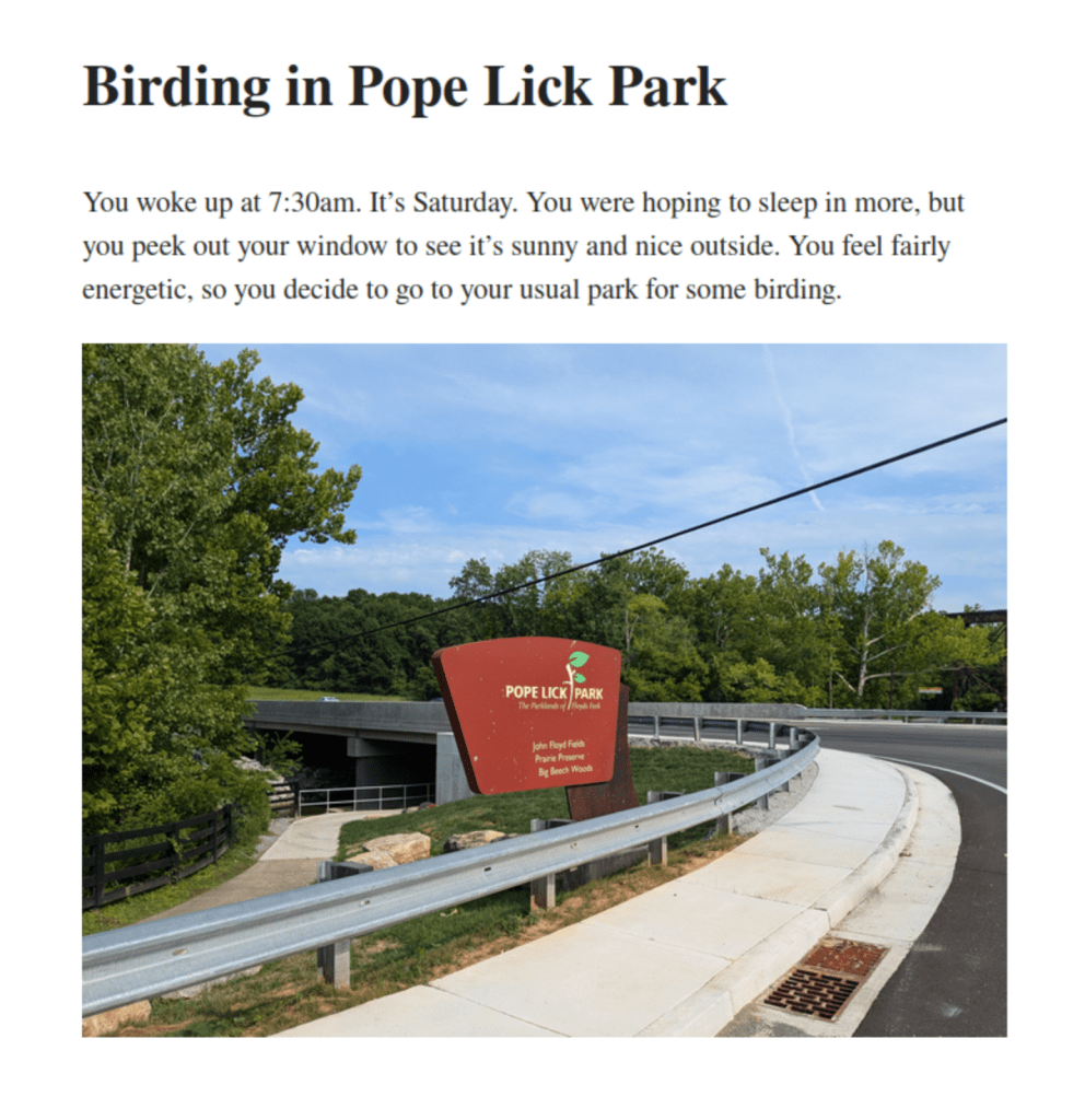For a little I felt like, “What’s the point of the story?” but clicking on the birds I saw along the way became more and more compelling. I hate repeating text (which I got a little as I wandered around) but the game clearly remembered when I’d been somewhere before, which meant I’d often see new text or even new birds in the same area. That was VERY cool. It really felt quite immersive, in the gentlest possible way. I began to find the scenery photos more compelling too, as it became clearer and clearer that this is, effectively, non-fiction. Everything here is real.