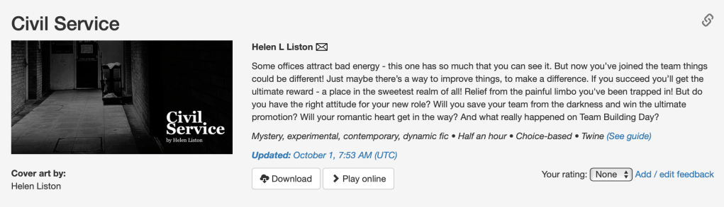 I forgot to explain last entry that the IF Comp is a big contest for Interactive Fiction stories that runs each year. I enter it often (ever since 2015), and love it. Partly because I usually do reasonably well, and mostly because the community is just SO GOOD. There are loads of people who gladly test games in the lead-up to the contest due date, and even more who help to judge games (and often write great, thorough reviews as well) during the six-week judging period. There’s even a secret section on the forum (which is here) where only authors who have entered that year can post and see posts.