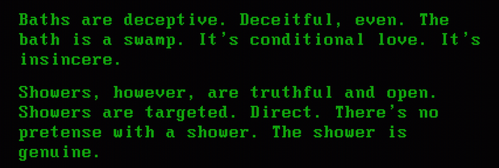 I’m surprised but pleased by the basic visuals and animation. They’re sweet. I don’t think they’re a custom thing; I think Inform or something can do things like that. But I could be wrong. And they’re not something I’ve played before, so they have novelty value for me. If every game had them, they’d be annoying.