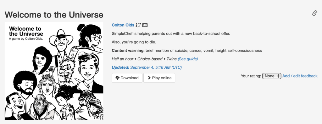 The opening confuses me even more, as it sounds educational. However, it’s very interesting, talking about a different version of Maslow’s Hierarchy of Needs. Which also doesn’t seem to relate to any of the information about this game I’ve been given so far. Is it comedy? Horror? Realistic? Fantasy? I can’t answer any of those questions, when normally I’d be able to answer them from the image OR the blurb OR the title OR the opening paragraph.
