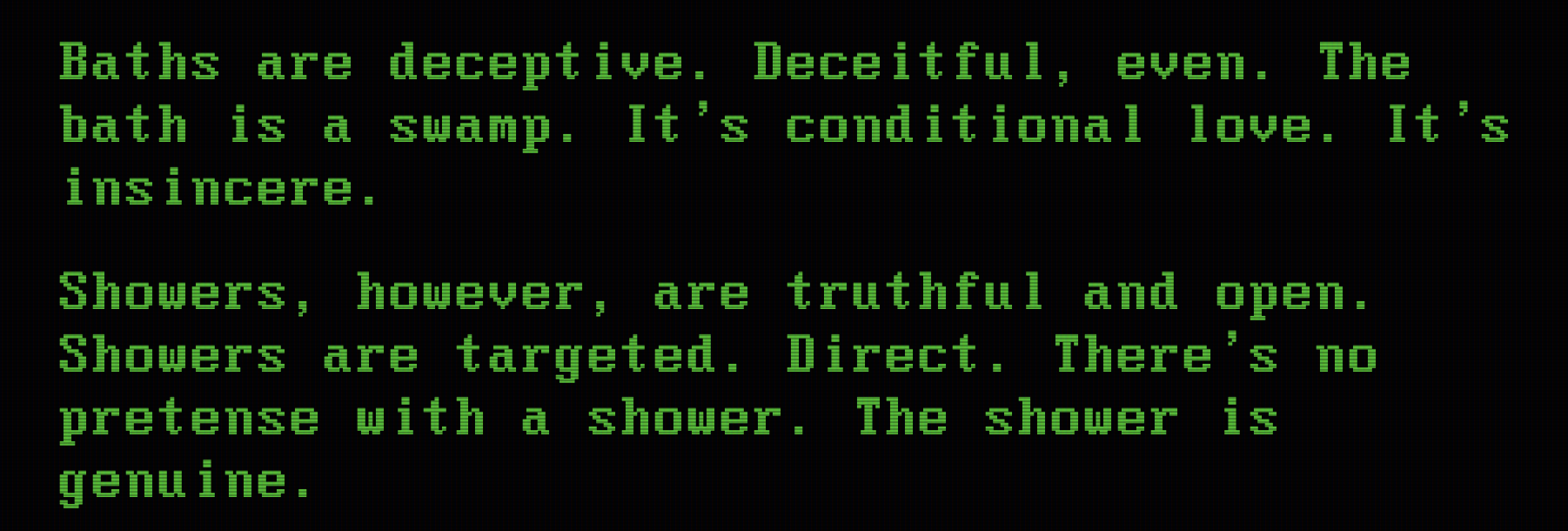 After a while, the poetic qualities grow stronger. It’s hard to know what the plot is, and sections seem disjointed. I’m not sure what my choices are doing most of the time.