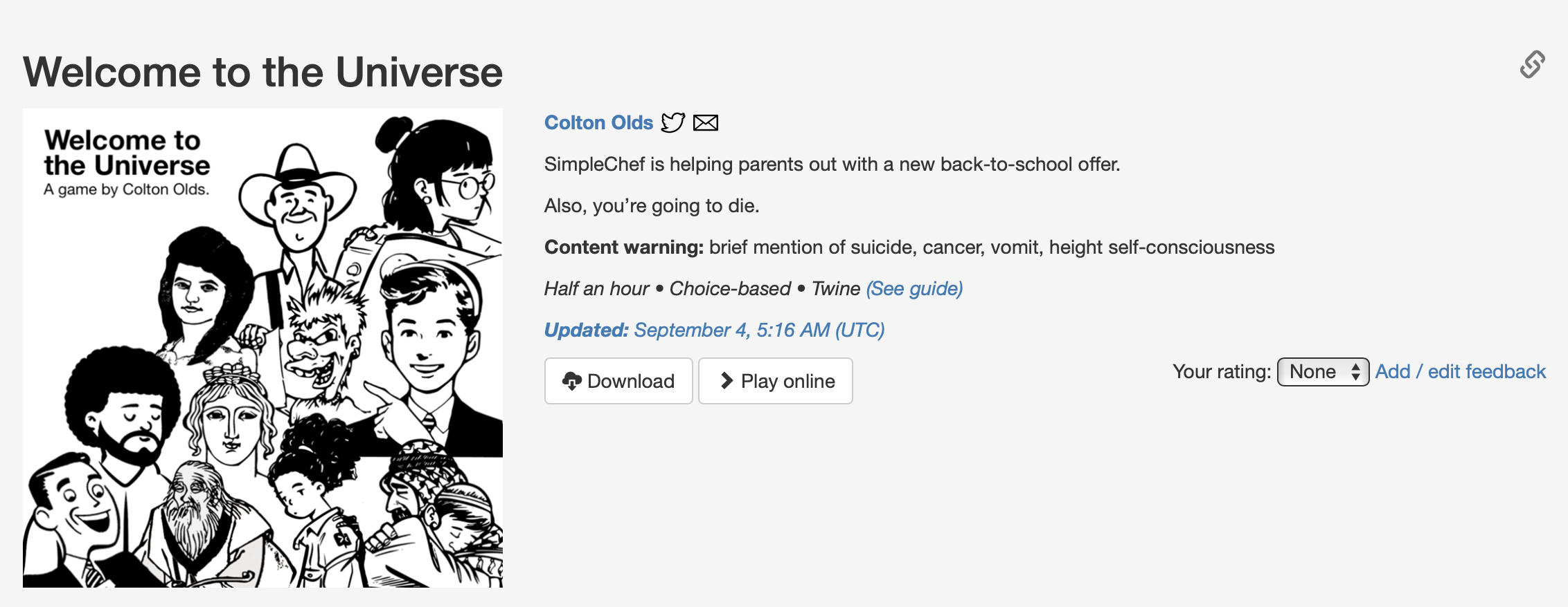 I forgot to explain last entry that the IF Comp is a big contest for Interactive Fiction stories that runs each year. I enter it often (ever since 2015), and love it. Partly because I usually do reasonably well, and mostly because the community is just SO GOOD. There are loads of people who gladly test games in the lead-up to the contest due date, and even more who help to judge games (and often write great, thorough reviews as well) during the six-week judging period. There’s even a secret section on the forum (which is here) where only authors who have entered that year can post and see posts.